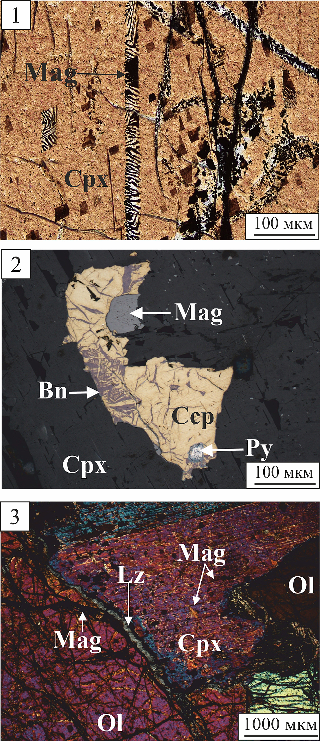 a — myrmekite intergrowths of magnetite (Mag) in clinopyroxene (Cpx) thin section OЯ-39-1b. Transmitted light, crossed nicols; b — crystalline magnetite intergrown with pyrite-chalcopyrite-bornite aggregate (Py, Ccp, Bn), thin section OЯ-6-2. Reflected light, parallel nicols; c — magnetite filling cracks in olivine (Ol) and joint in clinopyroxene (Cpx), thin section OЯ-12-1. Transmitted light, crossed nicols