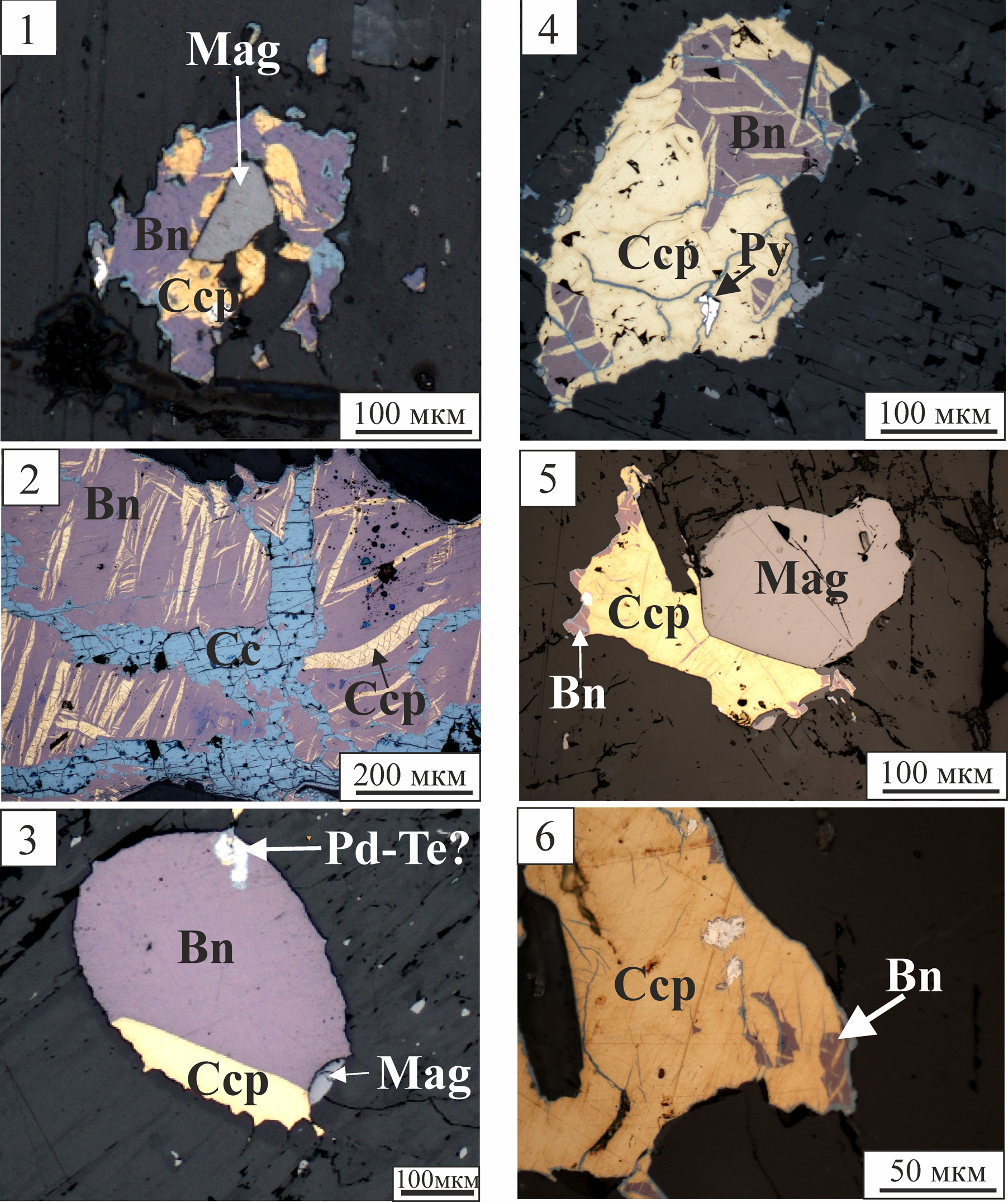 a — magnetite crystal (Mag) is cemented by chalcopyrite-bornite aggregate (OЯ-6-2); b — chalcopyrite (Ccp) lamellae in bornite (Bn) and chalcocite (Cc) along microcracks (OЯ-6-3); c — chalcopyrite-bornite droplet with an inclusion of Pd-Te mineral (OЯ-13); d — chalcopyrite + bornite intergrowth with pyrite (Py) inclusion (OЯ-20-1); e, f — magnetite crystal is cemented by chalcopyrite (OЯ-20-2). Optical images of polished sections in reflected light, parallel nicols