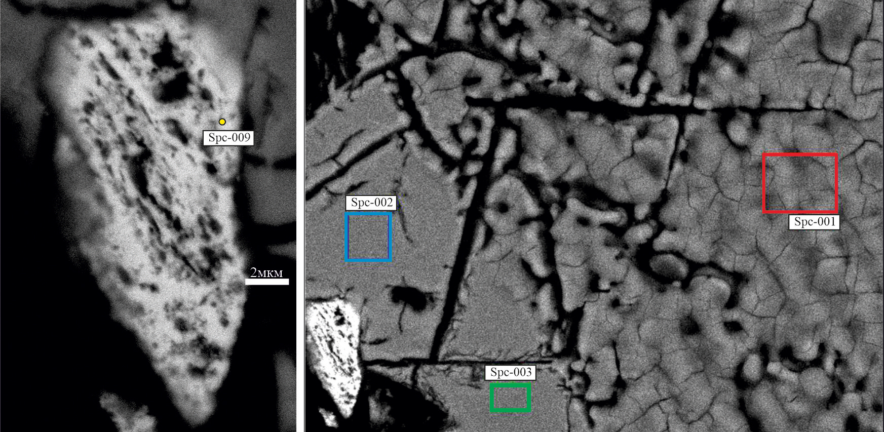 Рис. 9. Включение теллурида палладия (светлое включение состава СPd ≈ СTe, вероятнее всего котульскит) в халькопирите, слева — увеличенный фрагмент с изображением включения (ОЯ-28-2)