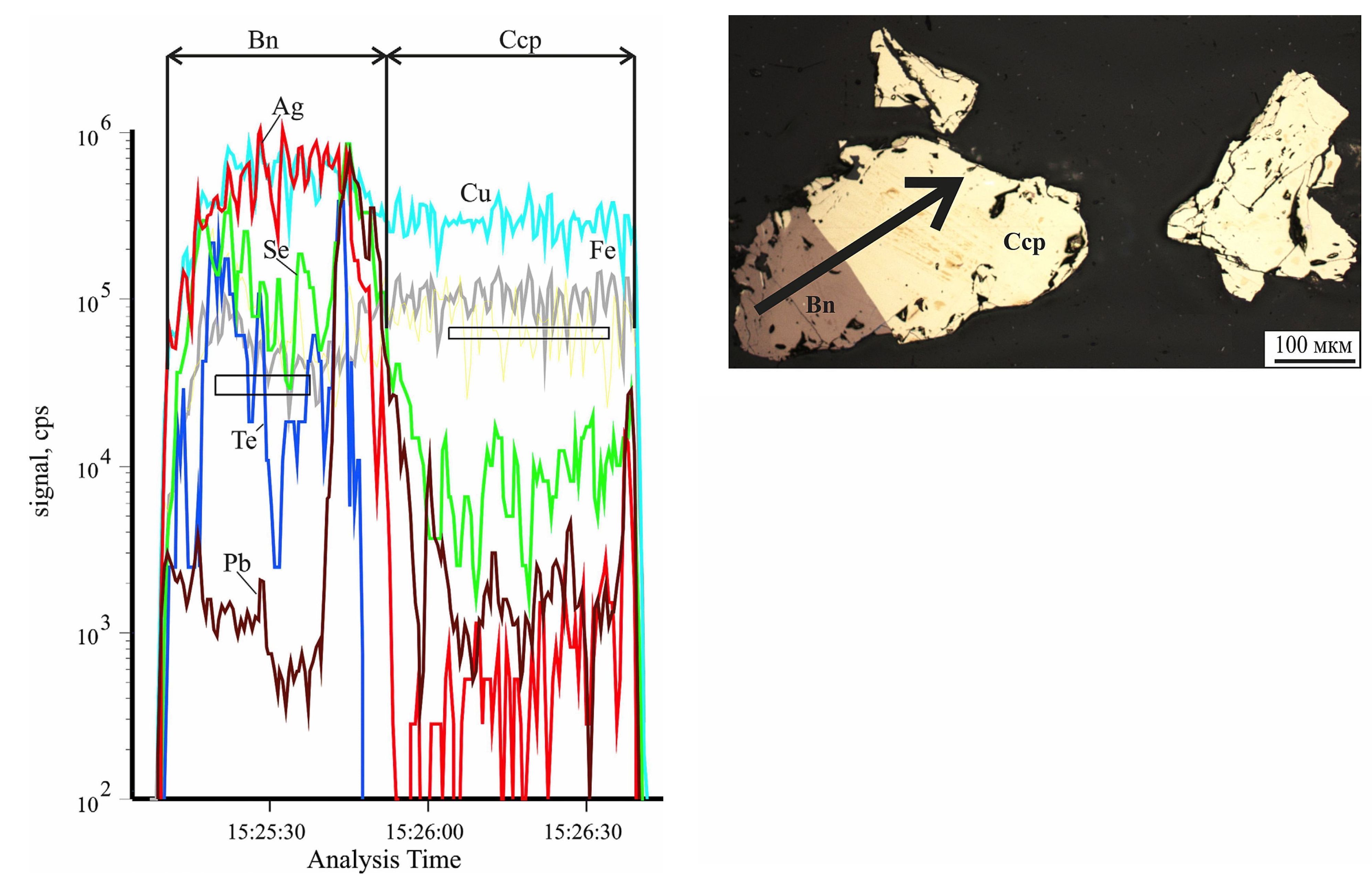 The trace elements are concentrated mainly in bornite and are Se = 6630 ppm, Ag = 3660 ppm, Te = 300 ppm, Pb is localized in the contact part of the minerals. Chalcopyrite contains an order of magnitude fewer trace elements. The correlation coefficients are Ag-Te-Se = 0.7—0.8