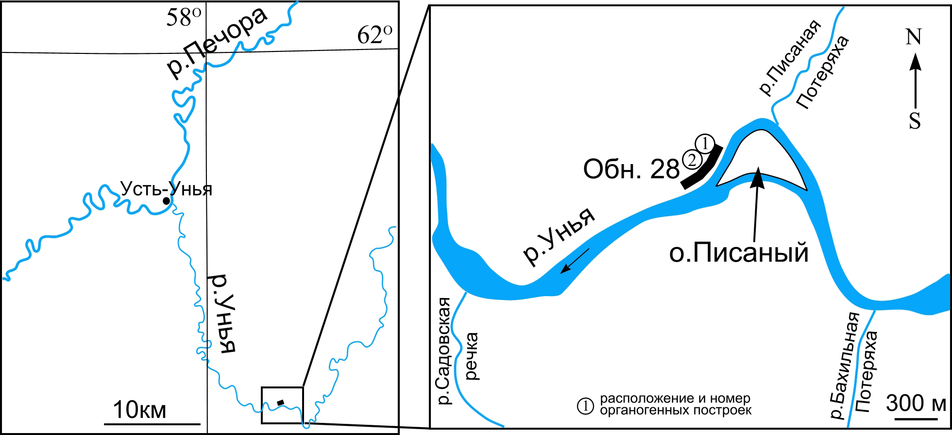 Рис. 1. Схема расположения разреза «Писаный Камень» (обн. 28) в бассейне р. Уньи