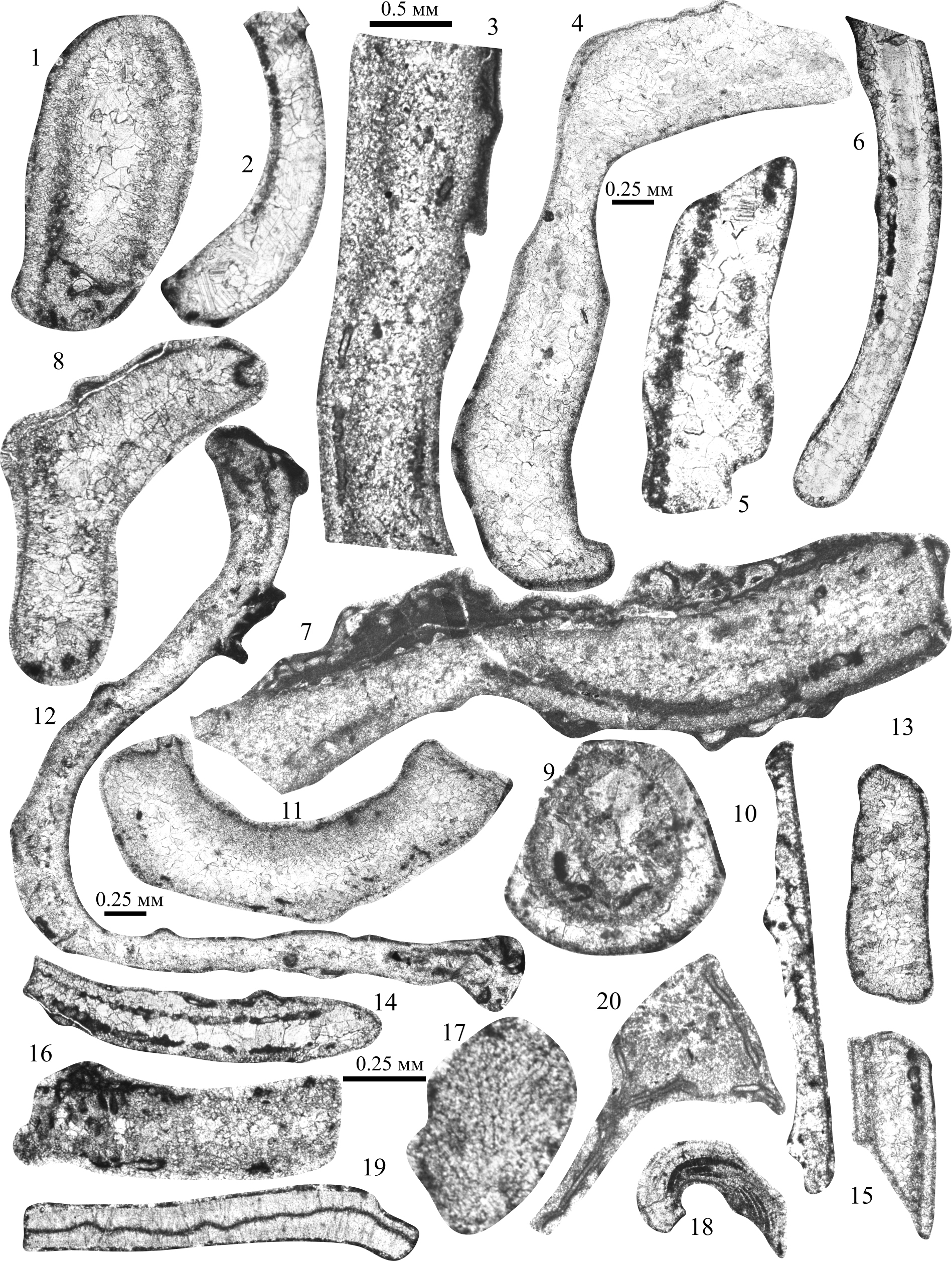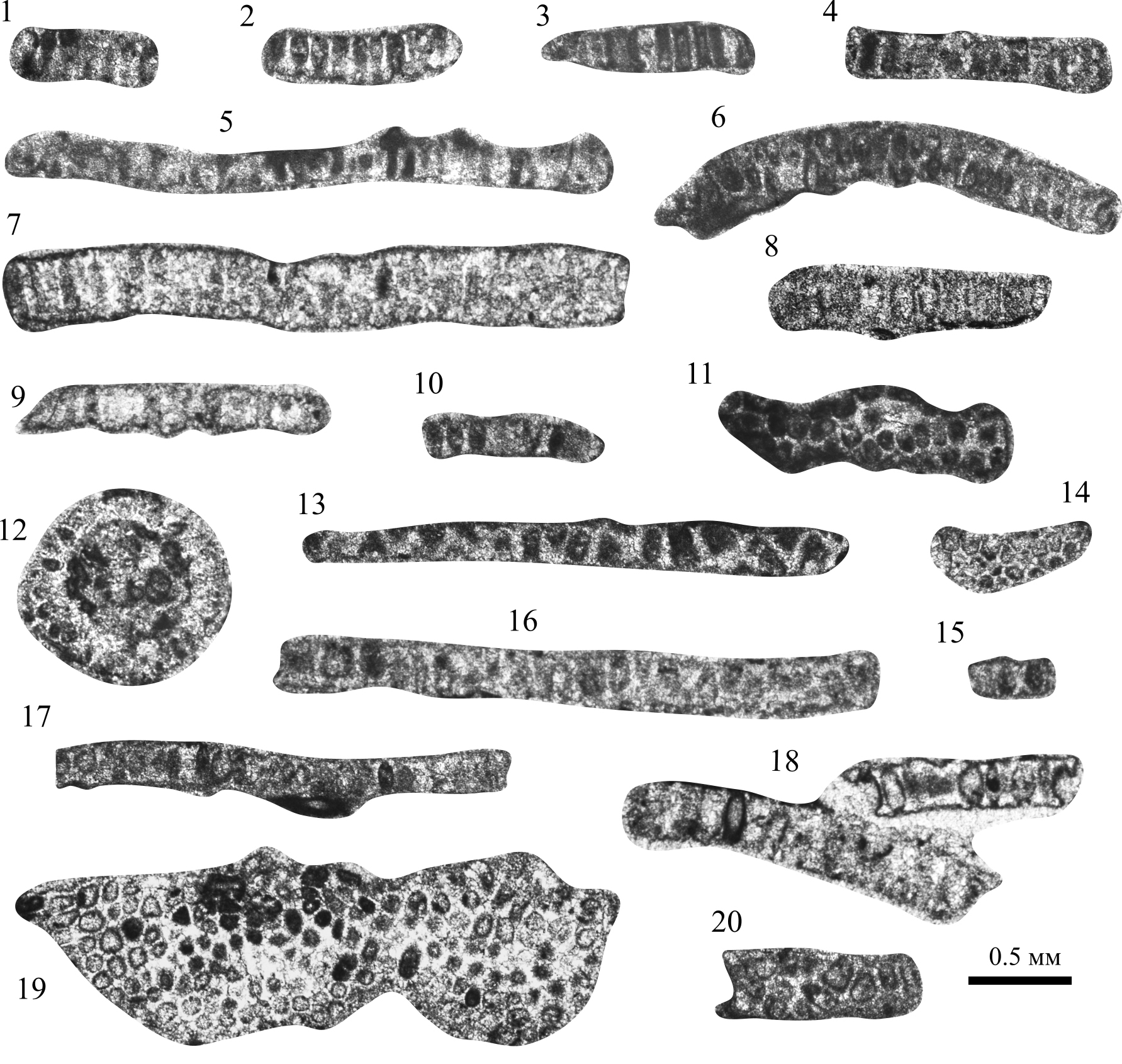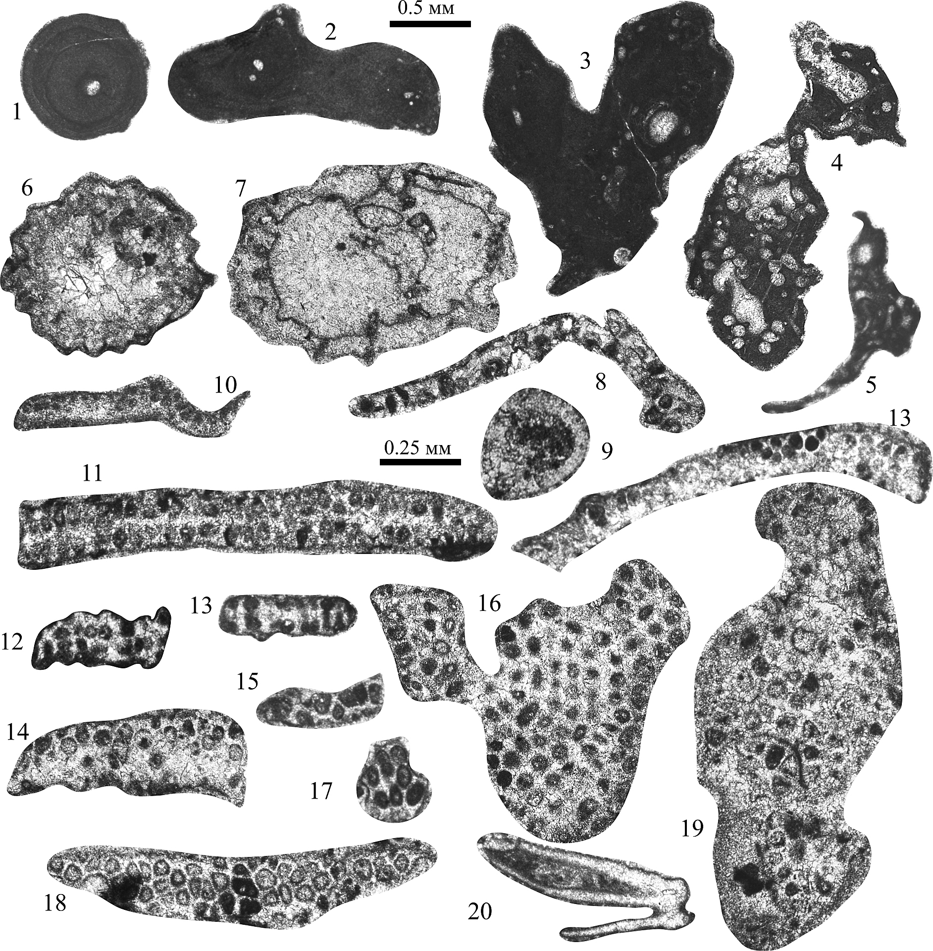 Fig. 1, 2. Tubiphytes obscures shamovella Rauser: 1 — sample 28/138, thin section; 2 — sample 28/134, thin section. Fig. 3. Tubiphytes obscures obscures Maslov, sample 28/134, thin section. Fig. 4, 5. Ellesmerella permica (Pia): 4 — sample 28/136, thin section; 5 — sample 28/137, thin section. Fig. 6. Gyroporella sp., sample 28/89, thin section. Fig. 7. Gyroporella clavata Tchuvashov, sample 28/142, thin section. Fig. 8. Gyroporella ex. gr. clavata Tchuvashov, sample 28/109, thin section. Fig. 9. Anthracoporella spectabilis Pia, sample 28/113, thin section, cross section. Fig. 10. Globuliferoporella ilimensis Tchuvashov, sample 28/127, thin section. Fig. 11—13. Globuliferoporella symetrica (Johnson): 11 — sample 28/142, thin section; 12 — sample 28/136, thin section; 13 — sample 28/89, thin section. Fig. 14, 15, 17. Globuliferoporella cf. angulate Tchuvashov: 14 — sample 28/137, thin section; 15, 17 — sample 28/85, thin section. Fig. 16. Globuliferoporella angulata Tchuvashov, sample 28/128, thin section, tangential slice. Fig. 18, 19. Atractyliopsis carnica E. Flügel, tangential slice: 18 — sample 28/142, thin section; 19 — sample 28/137, thin section. Fig. 20. Clavaporella (?) sp., sample 28/100, thin section