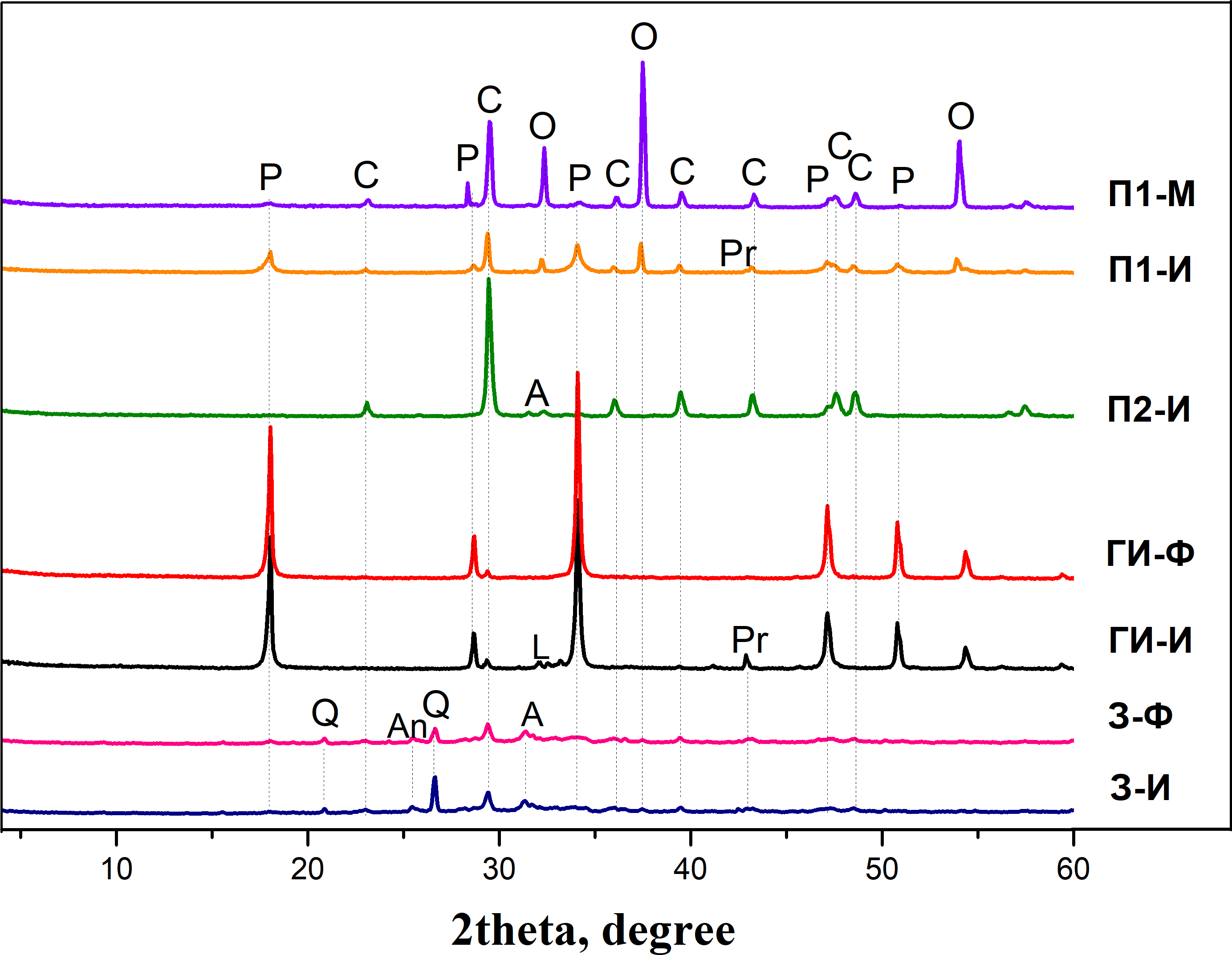 Рис. 2. Дифрактограммы вторичного минерального сырья: P — портландит, С — кальцит, О — оксид кальция, А — апатит, Pr — периклаз, Q — кварц, An — ангидрит