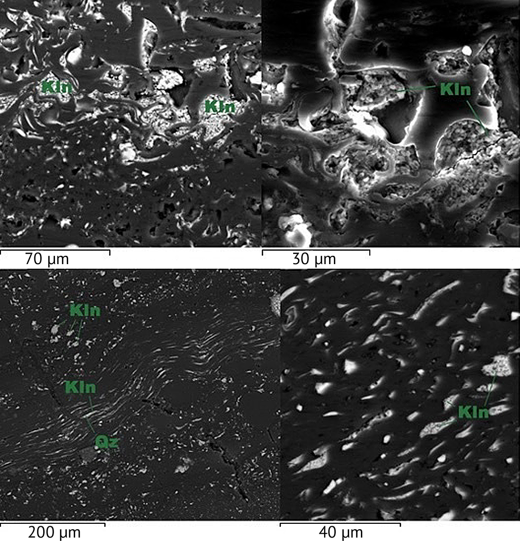 Рис. 4. Фрагменты аншлиф-брикета (микрофотографии): Kln — каолинит; Qz — кварц; уголь — чёрное