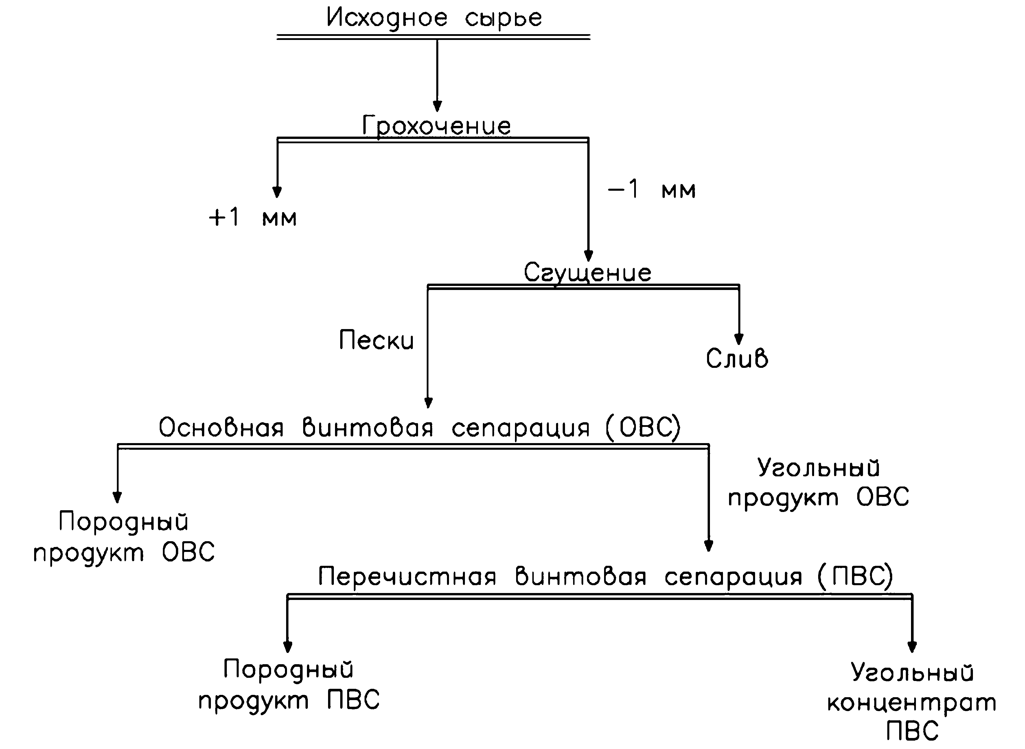 На основании полученных данных на исследуемом сырье были проведены технологические испытания. Предварительно из обогатительного процесса был выведен материал крупностью более 1 мм при помощи операции грохочения. Тонкодисперсный материал менее 0.04 мм из подрешётного продукта грохота был удалён гидроциклоном. Дальнейшее обогащение песков гидроциклона выполнено на винтовом сепараторе. Поскольку во время обогащения угля на винтовом аппарате происходит обратное обогащение, т. е. концентрация углистых и углисто-глинистых пород осуществляется в бортовой части рабочей поверхности жёлоба винтового аппарата, для получения наиболее чистого продукта были проведены две стадии винтовой сепарации: основная на песках гидроциклона и перечистная на угольном продукте основной винтовой сепарации. В результате по технологической схеме (рис. 6) удалось получить угольный концентрат с показателем зольности сухого топлива 10.95 %. Выход продукта составляет 41,15 %.