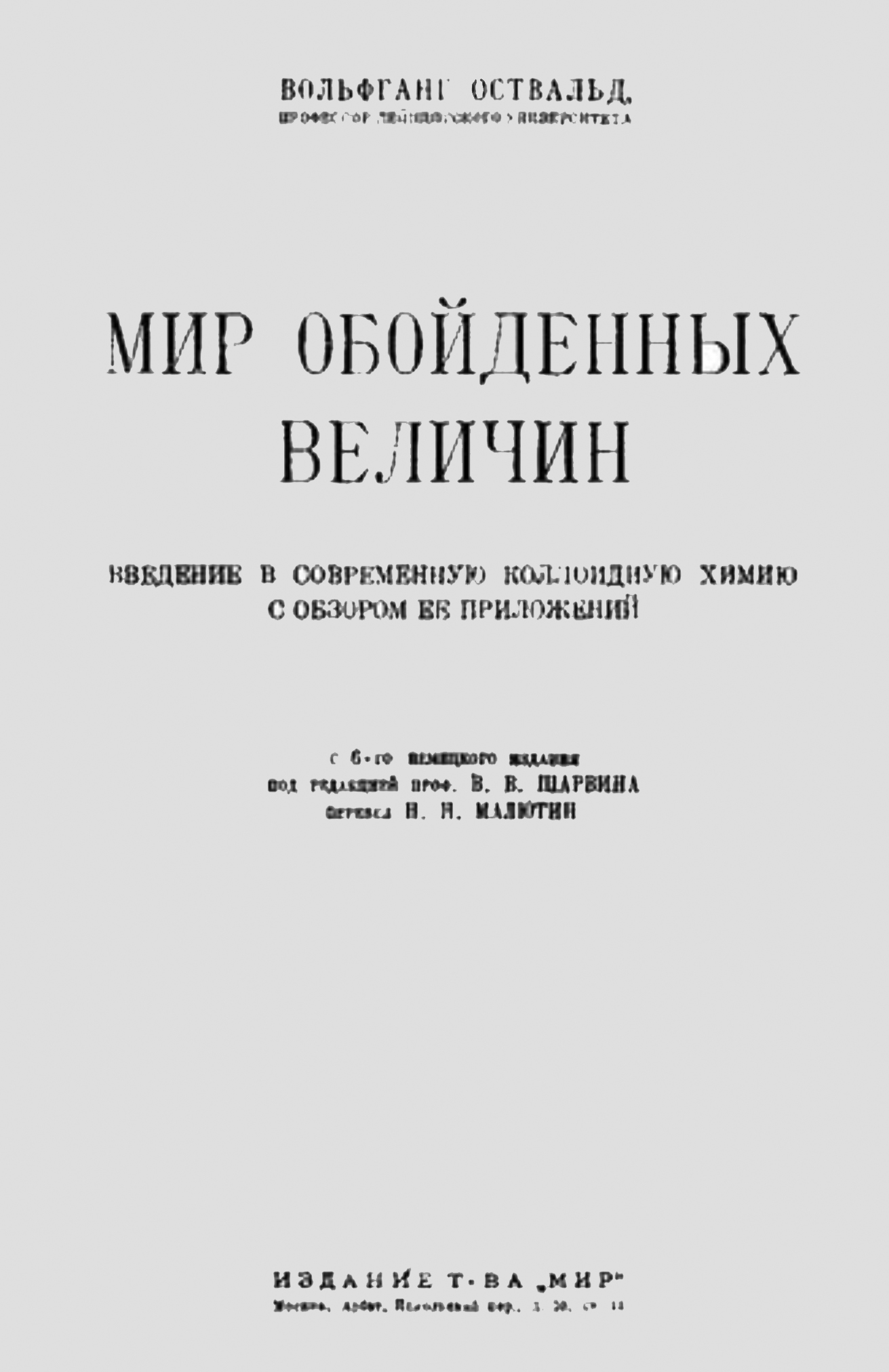 - Ostwald V. The world of neglected dimensions. Introduction to modern colloidal chemistry with a review of its applications. Moscow: Mir, 1923, 228 p. (in Russian)