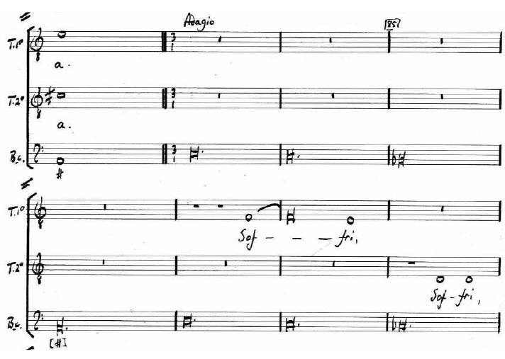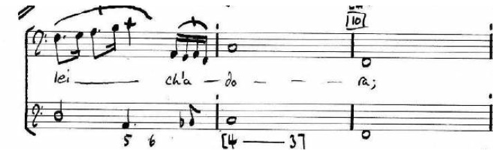 Интересно, что Уэнэм, анализируя этот диалог, выносит несколько любопытных суждений не только о гармонических тонкостях произведения, но и об оборотах, характерных для этого композитора вообще. В частности, он отмечает «любимый диссонанс» Санчеса (большую нону), которая обозначает в этом дуэте любовное томление пастушки. В кульминации использована фригийская каденция с нарастающей степенью диссонантности (пример 3, такты 65–66 и 68–69).