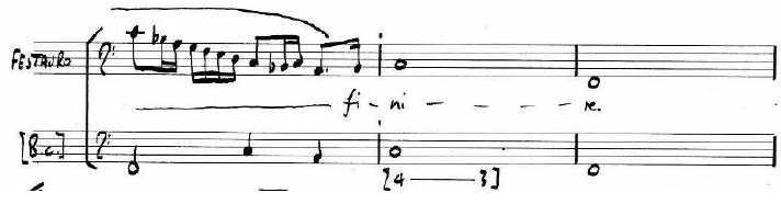 F.: Freno Tirsi il desio | Ф.: Тирси сдерживал своё желание, | Подчёркнуто слово freno (сдерживал): распев шестнадцатыми фигурой circulatio | V, плагальная каденция |