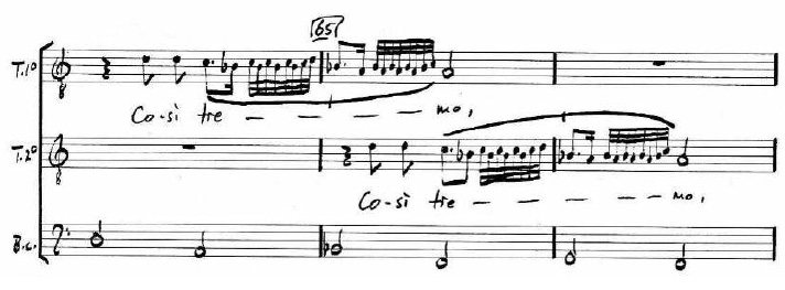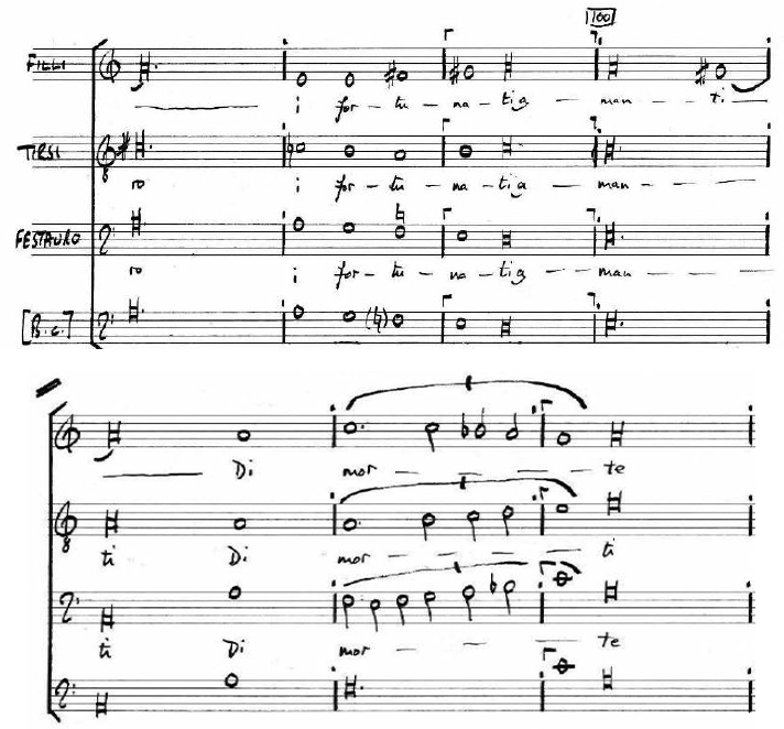Filli: Mori, cor mio, ch’io moro. | Филли: Умри, моё сердце, ибо я умираю. | Параллелизм трезвучий в партии b. c.: e, D, E | V, басовая клаузула; при повторении – I, басовая клаузула; V, басовая клаузула; I, басовая клаузула; IV, басовая клаузула; VII, басовая клаузула; III, басовая клаузула |