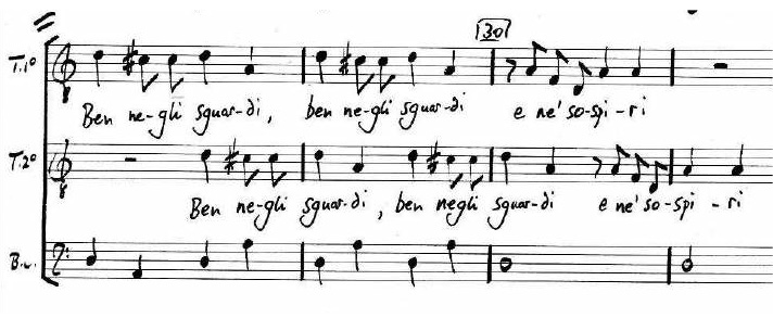 Disse, con occhi languidi e tremanti | Сказала с томным и трепещущим взглядом. | На басу f септима задержанием. На словах languidi e tremanti («томным и трепещущим») сначала увеличенная секунда между голосом и басом (f-gis), затем малая секунда (f-fis) | II, мажорная, фригийская |