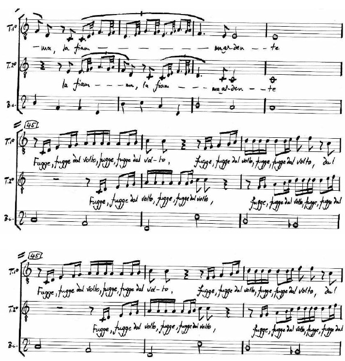 Характерно внимание к ключевым словам fiamma («пламя») и fugge («бежит») в канонической секвенции шестнадцатыми (пример 6).