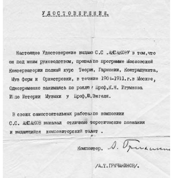 В соответствии с традициями аксаковского рода, для получения высшего юридического образования Сергей в 1911 г. поступил в Императорский Александровский лицей в Петербурге. Параллельно он брал уроки по композиции и оркестровке у профессора Санкт-Петербургской консерватории С.М. Ляпунова. По мнению А.С. Кулешова, «уже тогда обозначились музыкальные пристрастия Сергея Сергеевича, отдававшего предпочтение камерной музыке» [5, с. 173]. В удостоверении за подписью А.Т. Гречанинова напечатано: «В своих самостоятельных работах по композиции С.С. Аксаков выказал отличные теоретические познания и выдающийся композиторский талант»1.