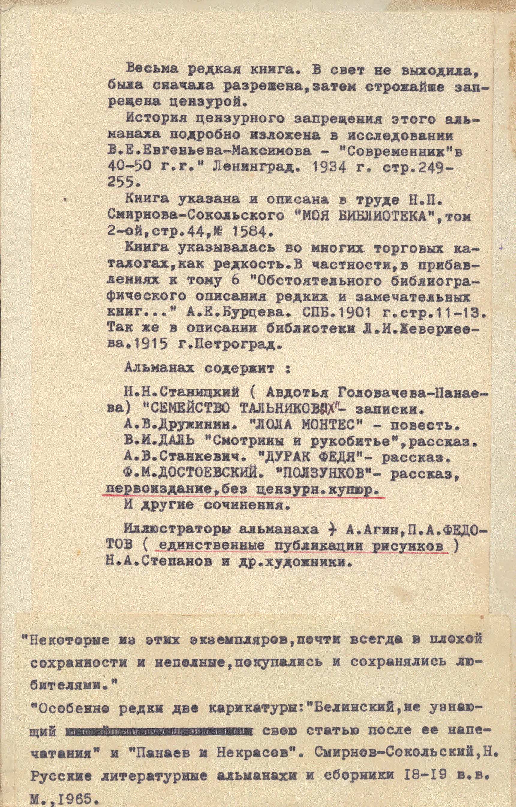 Например, в альманахе «Утренняя заря» на 1842 г. можно обнаружить машинописную вклейку с текстом следующего содержания: «Весьма редкая книга. В свет не выходила. Была сначала разрешена, затем строжайше запрещена цензурой» (ил. 7). Далее коллекционер расписывал публикации, авторы которых свидетельствовали о цензурной истории издания (В.Е. Евгеньев-Максимов), приводил описания альманаха, опубликованные в каталогах других коллекционеров (Н.П. Смирнов-Сокольский, А.Е. Бурцов, Л.И. Жевержеев). Особый интерес для музея представляет редкая карикатура «Белинский, не узнающий свою статью после её напечатания».