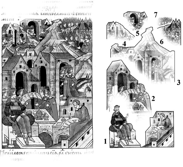 The primary feature of time in the Chronicles is its fluidity: “... the desire to depict the largest possible time is associated with the miniaturist’s desire to cover the largest possible space. Time and space are to some extent interrelated for him...” [4, p. 76]. In “ordinary” paintings, time is stationary; that is, they almost always record one moment, a one-time coordinate. Each miniature of the Illuminated Chronicles is a story in which events occur at different times. Time in miniatures usually flows from the bottom upward. This multitemporal leads to remarkable effects. For example, one miniature can depict the same character several times in different plot situations. Each situation and episode in miniature has its own time. We call this effect narrativity: “Artists used elements of nature and architecture, such as the eternity of natural formations (rivers, mountains, landscapes), the durability of human-made buildings (walls, temples, chambers) as “separators” of individual spatiotemporal unities...” [1, p. 227]. The miniature combines both visual and verbal principles; the story is told not in words but in images. Miniatures can consist of several separate paintings, interconnected by a thorough plot, with one miniature continuing the others, and so on ad infinitum. If we mentally continue this series, we will note something similar to a time spiral. It is noteworthy that the movement of time is not only from bottom to top but also from right to left, thus, leading to the image of a sphere. A painting always has a frame (even if it does not exist in reality, it is mentally implied, I.V.), limiting space and time: “A painting is a view in a window. In other words, it does not depict the world as a whole (like an icon) but only determines what is visible. The window serves as a unique viewfinder, enabling the artist to depict only what lies within the field of vision when gazing out the window” [17, p. 10]. Unlike a framed window, which is confined by a singular temporal and spatial coordinates, the time within the Illuminated Chronicle can be deemed infinite. It flows in all directions, much like space, and includes many spatial coordinates. What sets the ancient Russian miniature in this context apart from a well known genre such as modern comics, as narratives conveyed through a series of images? Fundamentally, this series is arranged in one direction and has one vector. Moreover, a comic fragment taken separately, cut from a general strip (frame), without correlating the pictures on the left and right with it, loses all meaning because its semantic load is significant only in the context of the entire story. Simultaneously, each miniature of the Chronicles and fragment isolated from it is efficient. For example, leaving a single eye, a hand gesture, or any other microfragment holds significance; these minute elements carry a semantic load that encapsulates the entire universe, the complete cosmos. In essence, miniatures are not restricted by the limitations of time and space; they are infinite not only as a collective but also in each of their fragments. If the Chronicles as a whole resemble a sphere, each miniature can be likened to a small sphere, and each fragment of a miniature is a microsphere. This encapsulates both a microcosm and a macrocosm as spheres within a sphere. The comics against the backdrop of these miniatures are a series of individual pictures and frames interconnected by a thorough plot. Consider, for example, a miniature from Osterman’s volume 2, the legend of the battle of Mamaev by l. OII 28, which depicts Prince Jagiello negotiating with Oleg Ryazansky to join Mamai’s army in the fight against Dmitry Donskoy (Fig. 1). This miniature comprises seven independent episodes, each with its characters. For a contemporary viewer raised in the Renaissance era, where the rule of three unities (unity of time, place, and action) prevails, grasping the artistic language of Ancient Rus’ in the 16th century can be challenging. The “reading” of the miniatures starts from the bottom, with the earliest scenes located at the bottom edge of the image and the later scenes at the top.