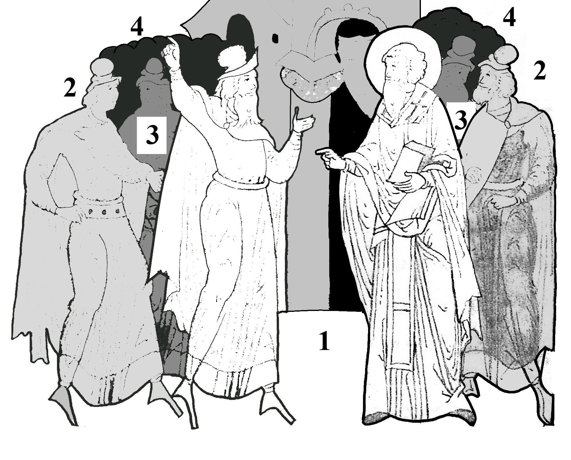 - The main characters are in front. The interlocutors are presented not as bearers of their positions but as exponents of a collective view. If a miniature depicts a dialog, then as a rule, it involves not only two people but many more.