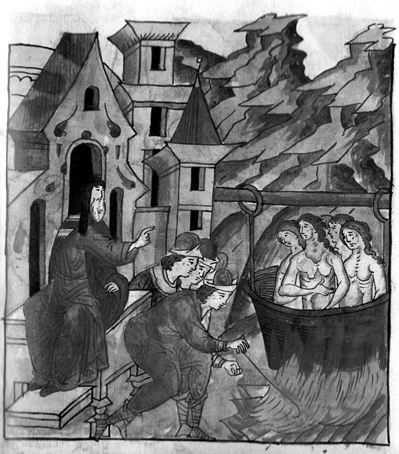 Russian poet and philosopher Alexey Stepanovich Khomyakov [18, p. 7], the founder of early Slavophilism, first proposed the term “conciliarism” as belonging of the truth to the entire Church, and not to an individual or institution, no matter how authoritative they were, as the free sharing of the joy of life or suffering by the entire brotherhood of people. This can be compared to a choir, in which each person sings in unison with others, bringing their tonality given to them by God, and the soloist only unites and strengthens the general chant. The Illuminated Chronicle has the same idea but is expressed in visual images. The absence of an individual portrayed as “alone” is a rarity in the context of the Illuminated Chronicle. It can be assumed that, within the medieval value system, the concept of an isolated individual did not exist; individuals were always seen as spokespersons or representatives of the entire team. This aspect underscores one of the most important characteristics of Russian culture, originating from the Russian mentality, which significantly distinguishes it from Western European individualism and the “cult of personality” that emphasizes unique individuality. In instances where a solitary character appears in the miniature, a rarity in the Chronicle, it is invariably accompanied by images of God in a mandorla or a blessing hand. This signifies that the person is not truly alone and is not abandoned by the Almighty. The Illuminated Chronicle notably lacks depictions of a solitary figure abandoned by everyone, a notable absence of a Hamlet-like figure in Russian culture. This is in stark contrast to the Western world, where Hamlet, the emblematic figure of a solitary individual tormented by doubts and devoid of both human and divine support, holds great symbolic significance. The absence of such imagery in the Illuminated Chronicles raises the question of Hamlet’s popularity in Russia. It might be that Hamlet, being a character fundamentally extraneous to the Russian people, becomes intriguing and attractive like a forbidden fruit. Examining one of the miniatures in the Illuminated Chronicle can shed light on the implementation of the principle of conciliarism as an artistic device, elucidating the unique compositional situations presented in Fig. 2.