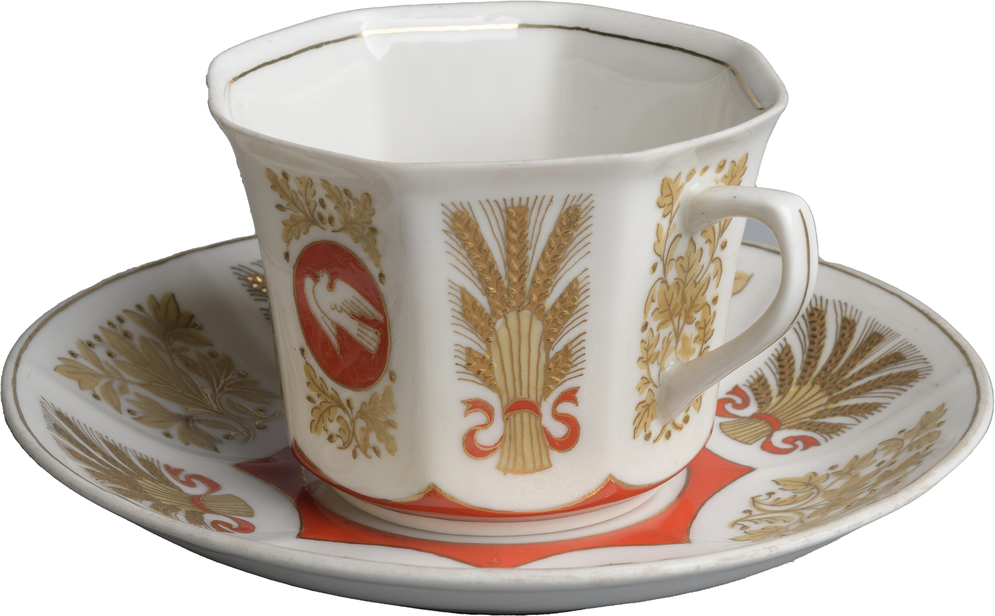 Ил. 1. Чекулина А.А. (автор модели). Чайная пара из сервиза «За мир». Завод «Пролетарий». Новгород. 1950-е гг. Фарфор, роспись надглазурная, золочение. Новгородский музей-заповедник. НГМ КП 29657-2 КФ-1018-2
