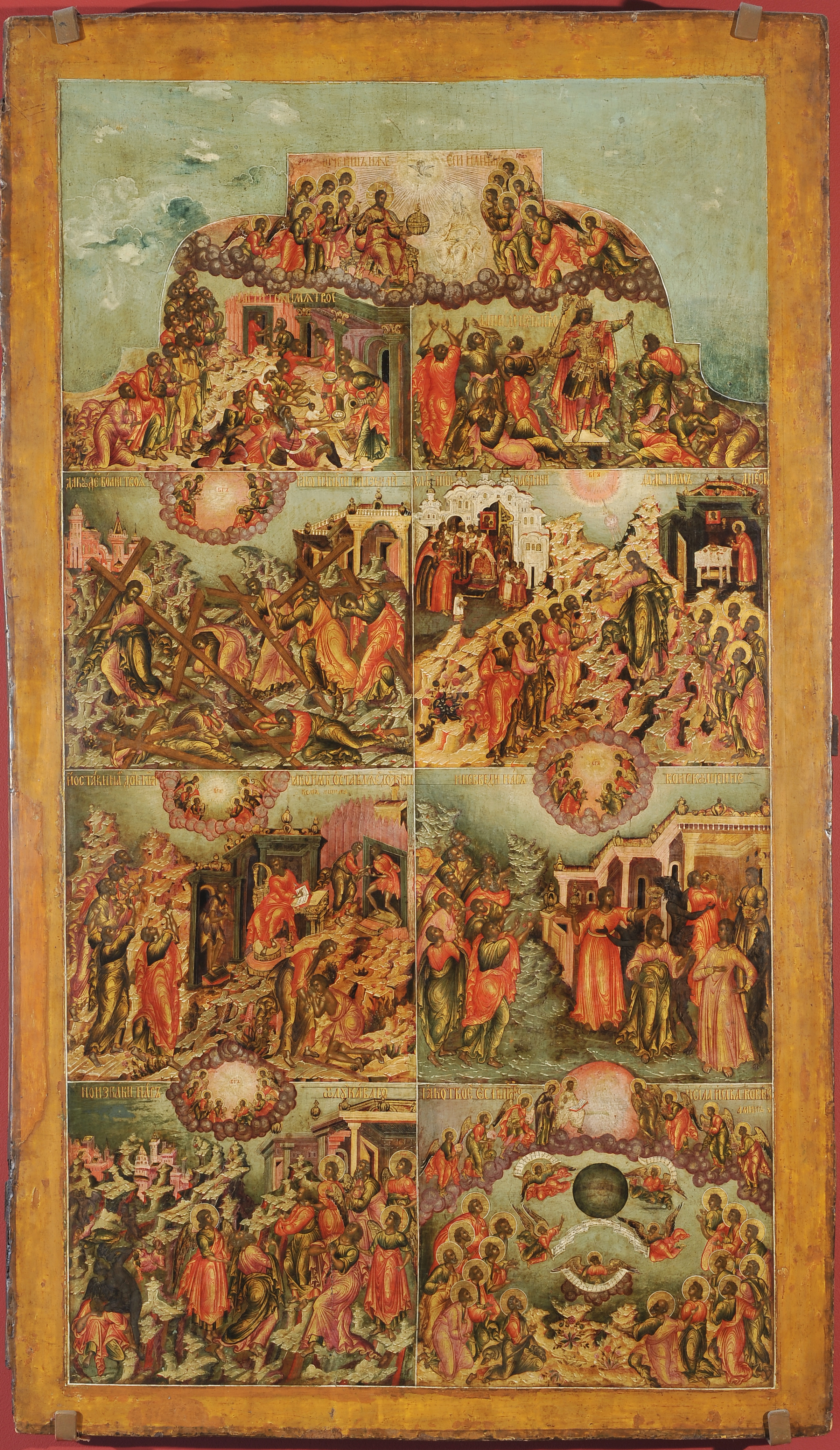 В рассматриваемом цикле между сценами нет вертикальных или горизонтальных разгранок, а для ориентации в нем введены 7 картушей с текстами. Этот прием – расположение картушей с пояснительными текстами в пространстве между отдельными сценами – встречается и в храмовых росписях, и на иконах, примером чему может служить образ «Богоматерь Живоносный Источник» конца XVII – начала XVIII в. (ГТГ)10.