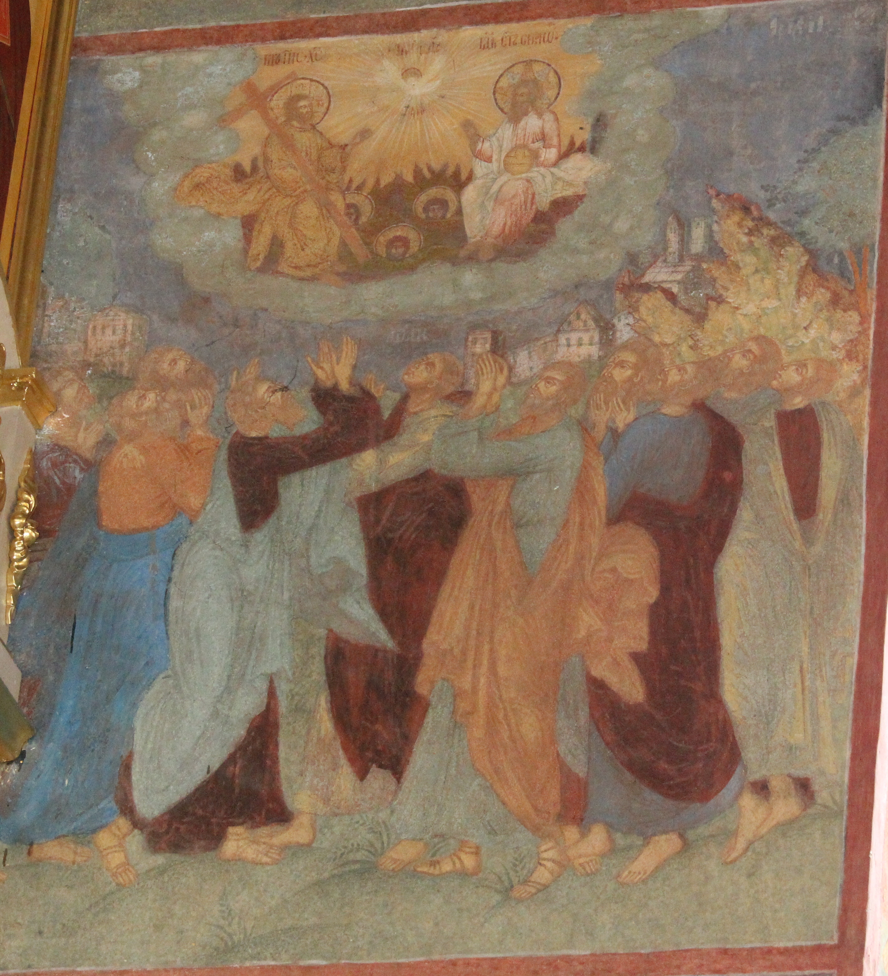 Определение источников необычных композиций «Отче наш» этого храма – самостоятельная исследовательская задача; существенно, что мы впервые имеем дело с циклом в виде единого фриза, последовательно размещенного в одном ярусе росписей.