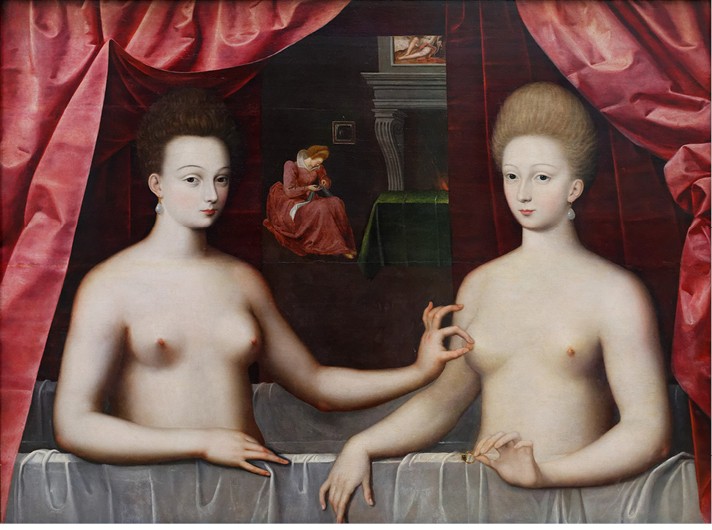 Герцогиня, фаворитка Генриха IV, уже была запечатлена в аналогичном образе. Теперь эта композиция (все еще с похожими алыми кулисами-драпировками, служанкой у камина) будто бы отзеркаливается: у купальщицы появляется двойник, наделенный практически теми же физиологическими характеристиками, за исключением цвета волос. По сравнению с созданными Клуэ и его последователями портретами, наполненными живописными натюрмортами и многочисленными подробностями, отличительной особенностью данного произведения школы является лаконизмо, строгость локальных цветов (кажется, их всего три: белый, изумрудный и алый) и совершенной гармонией обобщённых форм обнаженной натуры. Подобные колористические приемы и специфика пластической трактовки человеческого тела как будто являются прямым продолжением искусства Жана Фуке, а именно стилистических особенностей правой створки Меленского диптиха.