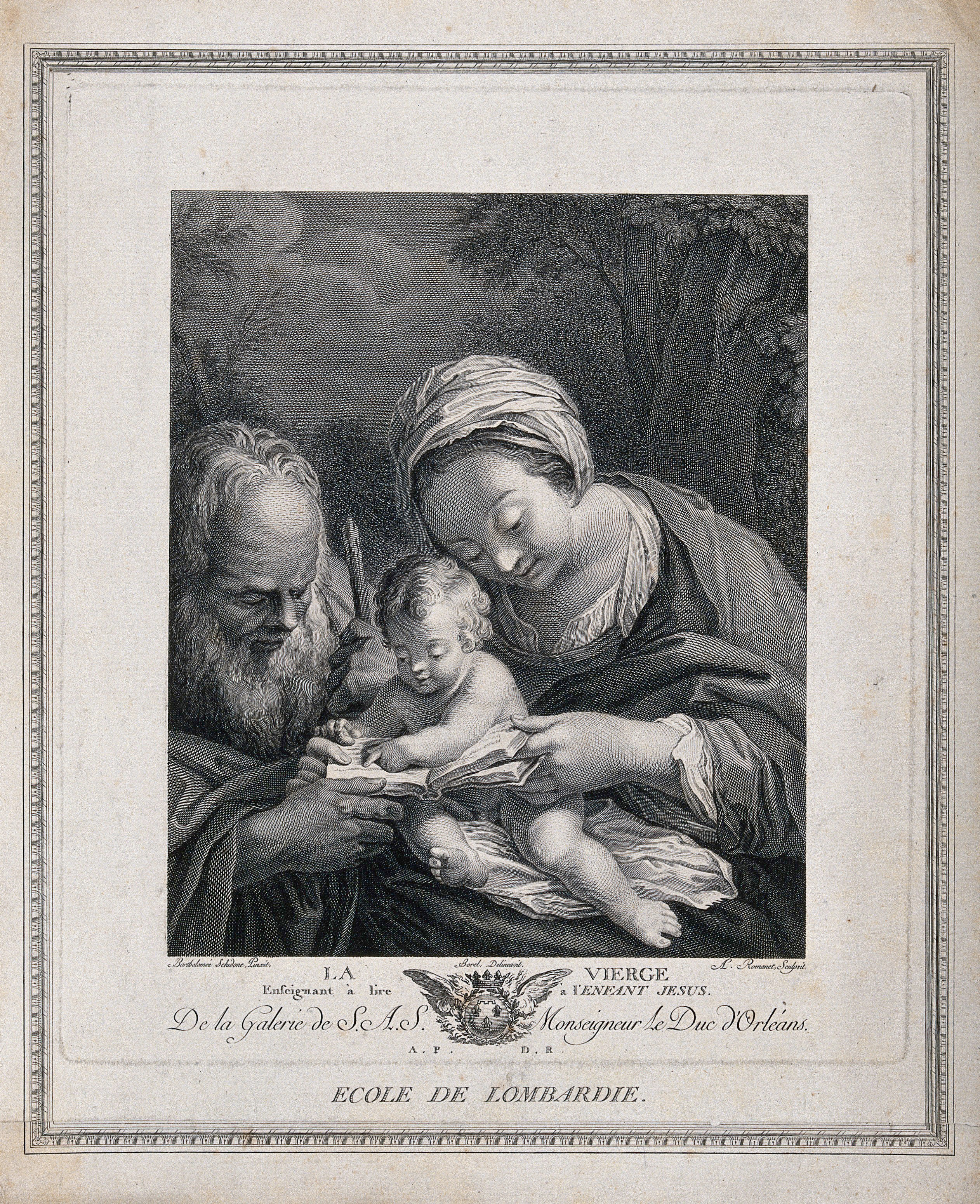 Ил. 4. Гравюра Антуана Луи Романе по оригиналу Бартоломео Шедони «Богоматерь, обучающая чтению Младенца Иисуса». Конец XVIII в. Резец. Москва. Частное собрание