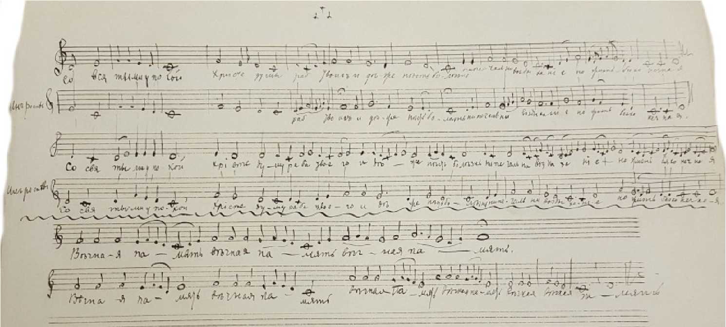 Долгое время центральной для танееведения была проблема многообразного преломления в музыкальном и научном творчестве композитора наследия западноевропейских полифонистов. Вместе с тем еще В.В. Протопопов отмечал, что, разрабатывая контрапунктические техники, Сергей Иванович «преследовал основную цель – развитие мелодического начала в музыкальном мышлении» [17, c. 91]. Помимо занятий контрапунктом на мелодическое мышление Танеева в значительной мере повлияли упражнения над переложениями и обработками обиходных мелодий, расшифровки крюковых рукописей,28 изучение истории древнерусского пения29 и, конечно, сочинение духовных песнопений на канонические тексты.