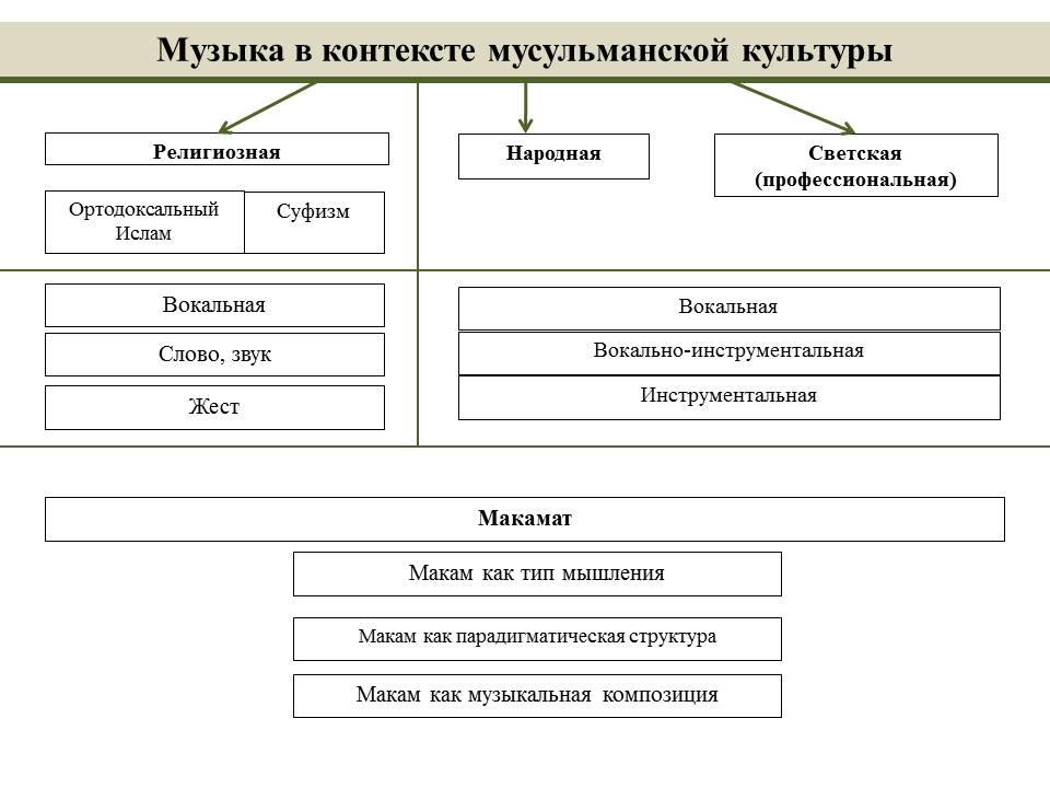 Кратко скажем, что в целом музыка в контексте мусульманской культуры складывается из нескольких компонентов (см. схему 1).