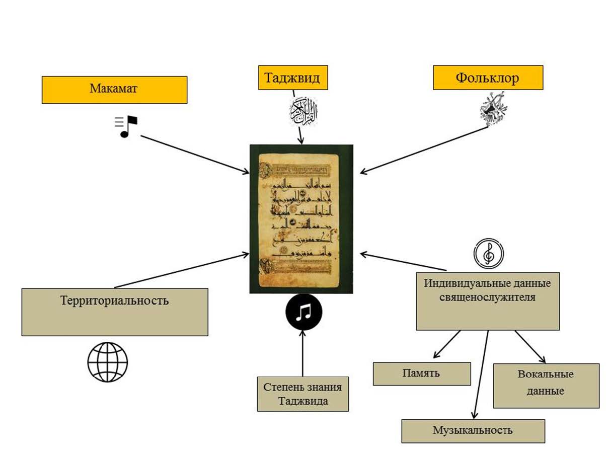 Как видно из схемы, все пласты (религиозная, фольклорная, светская) пронизывает система макамат, которая становится стержневой основой синтаксического музыкального языка. Макам рассматривается как тип музыкального мышления на уровне композиции и организации звуков в качестве парадигматической структуры. Макамное мышление пронизывает все виды музыкальной деятельности устной традиции и позднее – композиторские национальные школы, музыкальную культуру в суфизме, а также и пение в богослужебной практике ортодоксального ислама, где некоторые песнопения муэдзины исполняют в том или ином макаме. Пение в мусульманском богослужении представляет собой сложный музыкальный феномен, включающий в себя, с одной стороны, устойчивые базовые компоненты (макамат, таджвид, фольклорные интонации), с другой – компоненты, создающие инвариантность исполнения (территориальность, индивидуальные особенности священнослужителя) (см. схему 2).