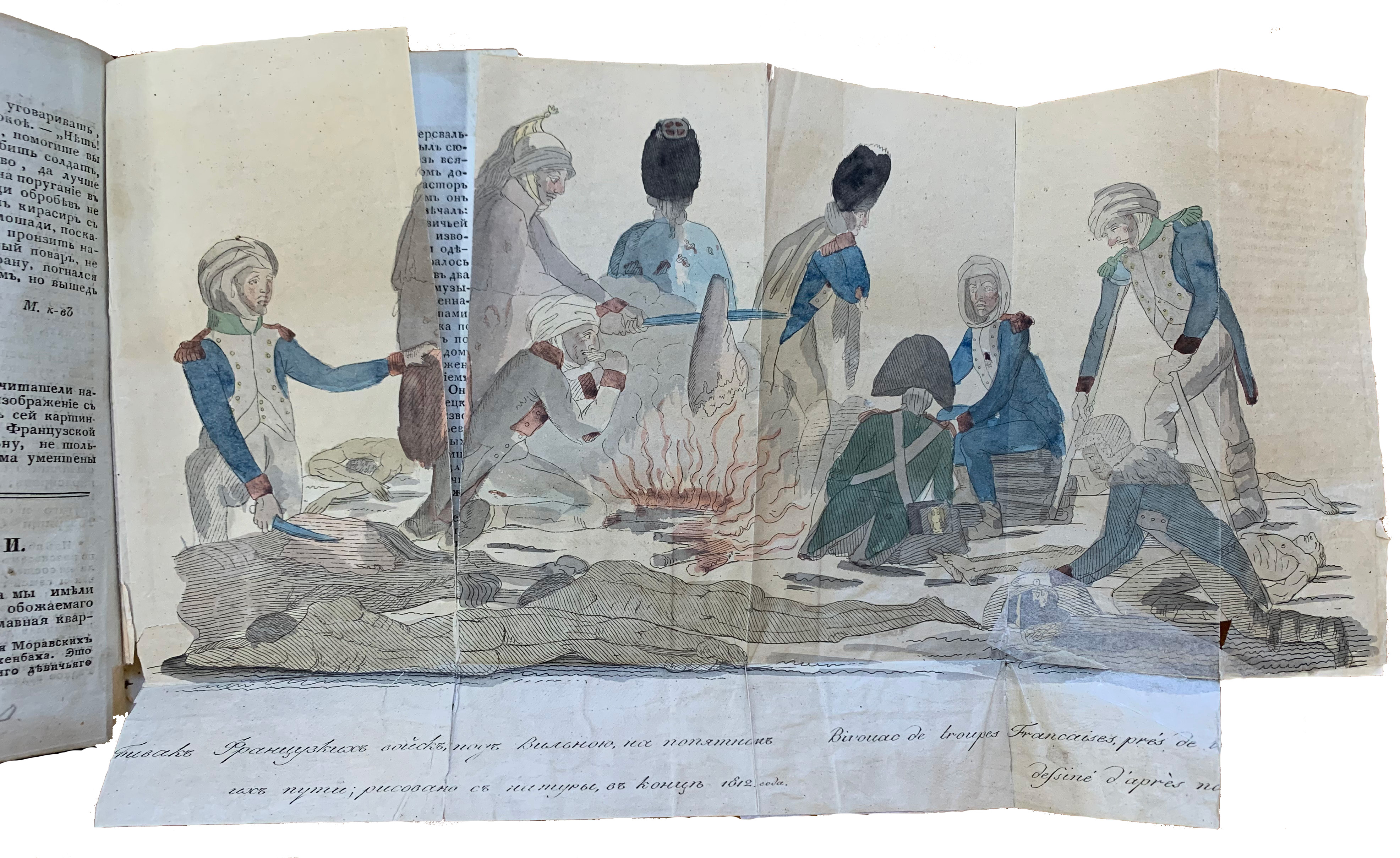 Вторая гравюра так же за авторством М. Богучарова – «Бивак французских войск под Вильною, на попятном их пути», опубликована в 1813 г. в Ч. 7, № 27 (рис. 7). Размер – 37,9 х 21,7 см, техника исполнения – резец, раскрашена акварелью. Лист из тонкой бумаги с разрывами и утраченными фрагментами, сложен в 5 раз, подогнут снизу на 4-5 см. В каталогах Д.А. Ровинского и В.А. Верещагина указано, что обе картинки были вклеены в № 27. Эти расхождения с экземплярами РНБ могли появиться из-за ошибки составителей или из-за особенности экземпляра, с которым они работали. Тем не менее для настоящего исследования они не существенны – комплект карикатур в журнале в обоих случаях совпадает.