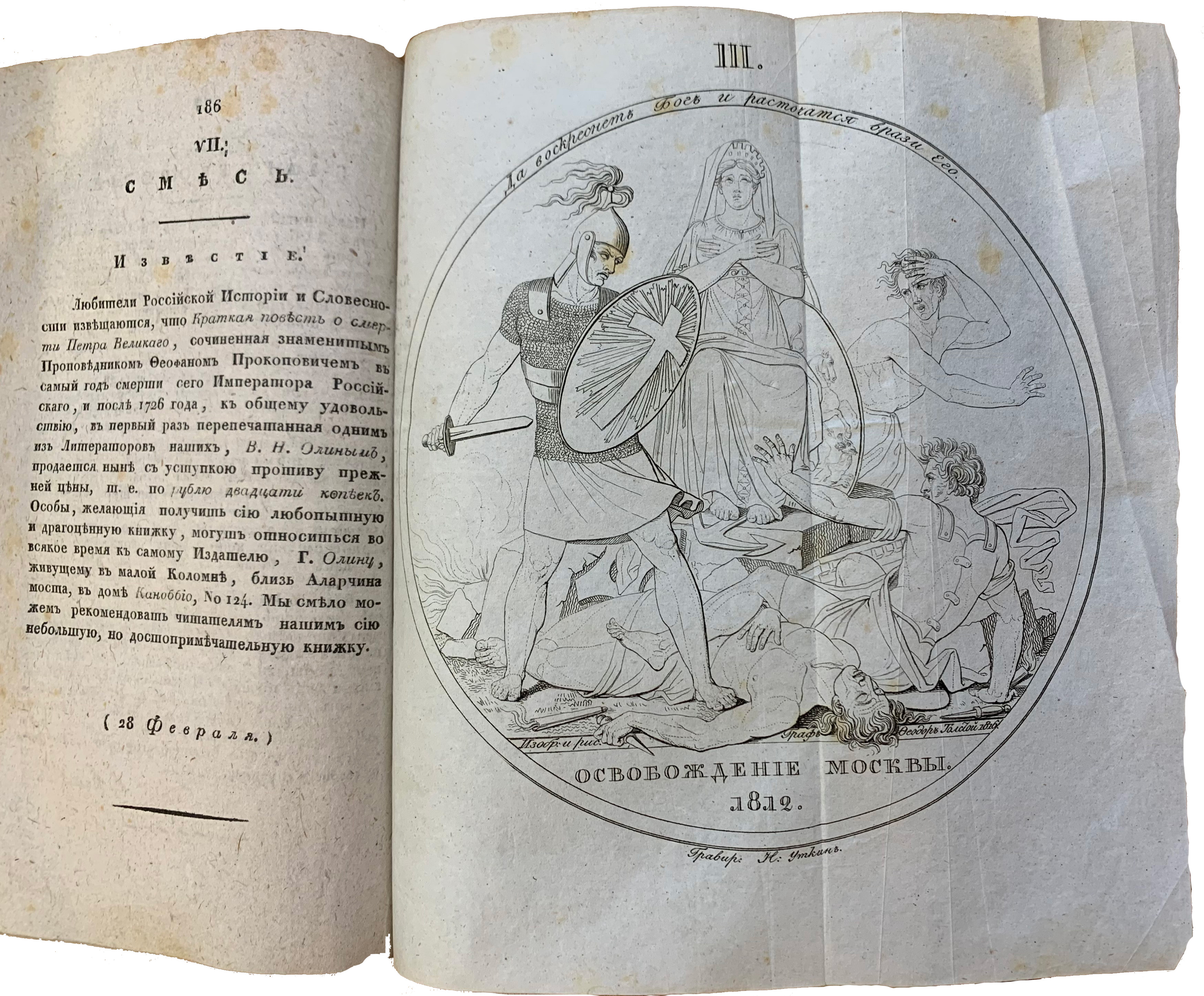 Рис. 9. Рис. Ф.П. Толстой, грав. Н.И. Уткин. Изображение медали «Освобождение Москвы. 1812» («Сын Отечества», 1820 г., Ч. 60, № 9). Очерковая гравюра. Лист – 18 х 20,1 см. Фото автора статьи