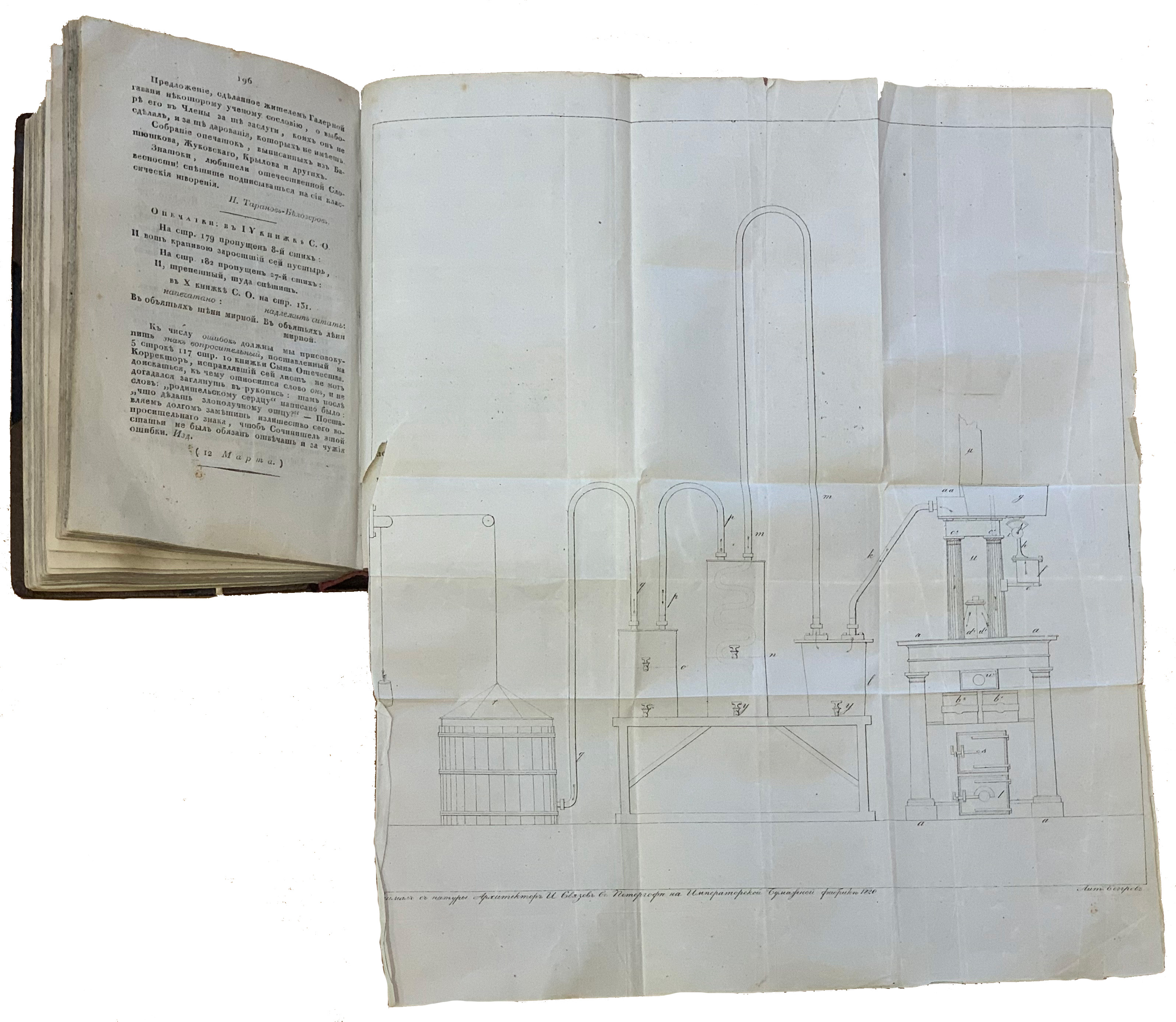 Рис. 10. Рис. И. Связов, лит. К.П. Беггров. Рисунок с препаратов, устроенных на Императорской бумажной фабрике в Петергофе, для делания масляного газа («Сын Отечества», 1821 г., Ч. 68, № 11). Литография. Лист – 31,5 х 37,7 см. Фото автора статьи