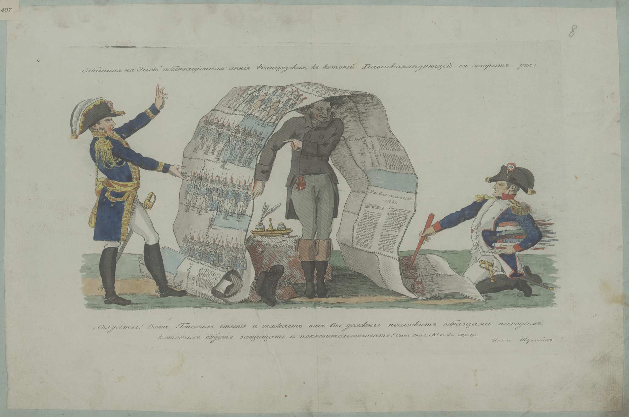 Предположим, что сразу все экземпляры крупнейших российских библиотек оказались дефектными: какие-то из иллюстраций были утрачены, очутившись в коллекциях страстных собирателей гравюры. Известно, что Д.А. Ровинский [13, т. 4, с. 572-573], П.А. Ефремов5 и другие библиофилы вырывали из книг и журналов интересующие их листы изображений, в некоторых случаях даже обрезая поля офортов. Допустим, таким образом карикатуры И.И. Теребенева когда-то стали частью собрания М.П. Погодина (ныне хранятся в РНБ). Часть данных листов имеет ссылки на журнал. Однако их внешние данные говорят о том, что иллюстрациями они просто не могли быть. Размеры офортов значительно превышают размер переплета: «Собранная на Эльбе обсервационная армия французская», изображение – 22,5 х 33,3 см, с полями – 29,2 х 40,7 см (рис. 11); «Французские мародеры испугавшиеся козы», изображение – 20,7 х 26 см, с полями – 23,5 х 30,4 см; «Консилиум», изображение – 21 х 30,9 см, с полями – 30,9 х 39,3 см; «Чем он победил врага своего? Нагайкою!», изображение – 20 х 32,5 см, с полями – 30 х 40 см. При этом ни одна из гравюр не имеет признаков того, что она была сложена, дабы быть умещенной в переплет журнала. То же касается гравюр И.А. Иванова: «Хлебосольство отличная черта в характере народа Русского», изображение – 22,2 х 31 см, с полями – 29,8 х 37,6 см и «Руской Курций. Ратник Московскаго ополчения», изображение – 22,5 х 31 см, с полями – 31 х 39,5 см (данное изображение когда-то было сложено вдвое, но этого все равно было бы недостаточно для того, чтобы поместиться в журнале).
