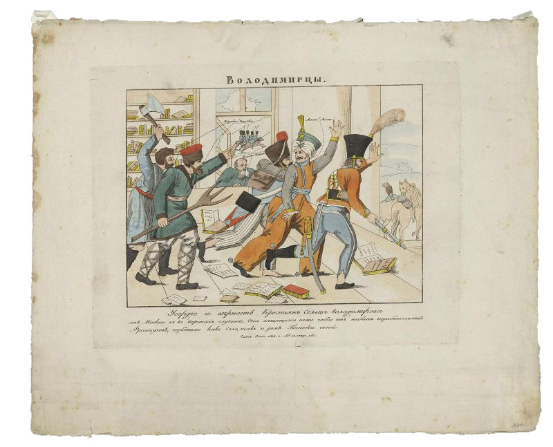 Собиранием графики времен Отечественной войны 1812 г. занимались знаменитые библиофилы и любители гравюры. Обратимся к фундаментальным справочным трудам по теме русской карикатуры, составленным ими. В «Русских народных картинках» Д.А. Ровинского [9] почти все упоминания «Сына Отечества» встречаются только в цитированиях текста гравюр. На принадлежность этих листов к журналу составитель в библиографических записях не указывает. О внешнем виде карикатур мы узнаем из формулировок «крепкая водка», «в лист», «в длину».