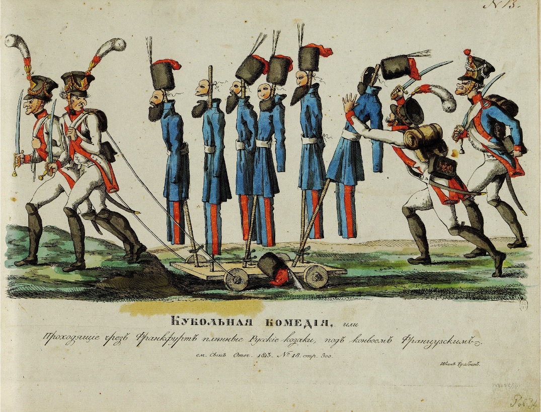 Такие же варианты с ссылками на «Сына Отечества» и без характерных следов от сгибов мы можем обнаружить и в других крупнейших собраниях гравюры. В ГИМ: «Володимирцы» Бугаевского-Благодарного И.С., с полями – 34,5 х 43 см (рис. 12); «Казаки прокатывают французских офицеров» предположительно А.Г. Венецианова, с полями – 23,1 х 31,9 см. В Государственном Русском музее: «Кукольная комедия», изображение – 18,1 х 34,0 см (рис. 13), с полями – 26,9 х 35,3 см и «Русский Сцевола» И.И. Теребенева, изображение – 17 х 27 см, с полями – 24,3 х 34,2 см. В ГМИИ: «Крестьянин увозит у французов пушку» И.И. Теребенева, изображение – 20,5 х 29 см, с полями – 29,4 х 38 см. Интересная карикатура хранится в коллекции лубков в РГБ: «Смотр французским войскам на обратном их походе чрез Смоленск» И.И. Теребенева (рис. 14). Помимо того, что ее размер близок к размерам других листов (изображение – 22,5 х 41,1 см, с полями – 30,6 х 44 см), она также имеет ссылку, но уже на другое издание. Офорт иллюстрирует сюжет из газеты «Hamburgischer Correspondent»6. В годы французской оккупации германских земель (1811-1814 гг.) она носила название «Journal du département des Bouches de l’Elbe» и выходила на немецком и французском языках. Иллюстрацией к нему-то картинка с русской подписью уж точно быть не могла, тем более что об изображенном происшествии И.И. Теребенев явно узнал из материалов «Сына Отечества»7.