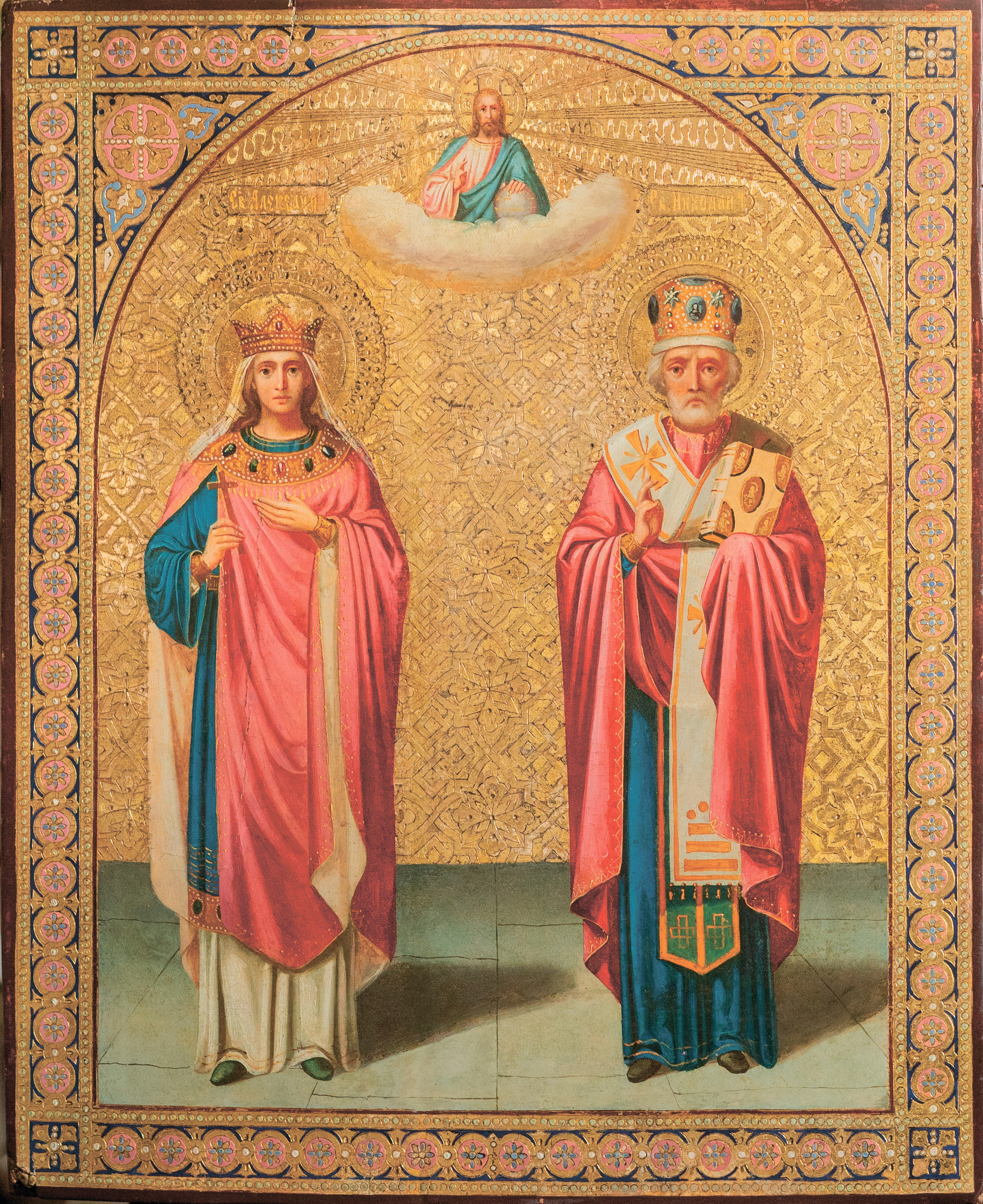 Образ святителя Николая Чудотворца и мученицы Александры Римской из частного собрания среднего размера (рис. 1) выполнен в технике масляной живописи по орнаментальному, золоченому фону. Святые представлены строго фронтально, в традиционной иконографии. Над ними расположено поясное изображение Христа Пантократора на облаке с благословляющей десницей и державой в левой руке. Одежды Спасителя традиционны, но максимально высветлены: он представлен в ярко-голубом гиматии и светло-розовом хитоне. По фону от нимба Христа расходятся волнообразные лучи, выполненные в технике резьбы (цировки) по левкасу. Композиция иконы заключена в римскую арку. Живописное решение ориентируется на академическое начало. Светотеневая моделировка складок одежд, ликов и рук решается от теплых теней, выполненных тонко, лессировочно, к холодной световой части, которая представлена плотными белильными мазками. Фигуры статичны, что придает небольшому образу некоторую монументальность. При этом рисунок основных форм упрощен и в определенной степени декоративен. В лаконичных цветах не прослеживается живописной взаимосвязи, для складок одежд характерна контурность и условность. В облачении царицы просматривается сочетание восточной и западной традиций. К первой можно отнести наличие оплечья (бармы). Этот элемент имел символическое значение при венчании на царство правителей Руси в допетровскую эпоху [17, с. 51]. Венец на голове царицы по форме тяготеет к западноевропейским средневековым образцам. Царский убор изображен в виде короны с чередующимися по высоте острыми завершениями. Он декорирован драгоценными камнями и жемчугом в соответствии с иконописной традицией. Аналогичные формы встречаются в произведениях поздней русской иконописи [18, с. 88].