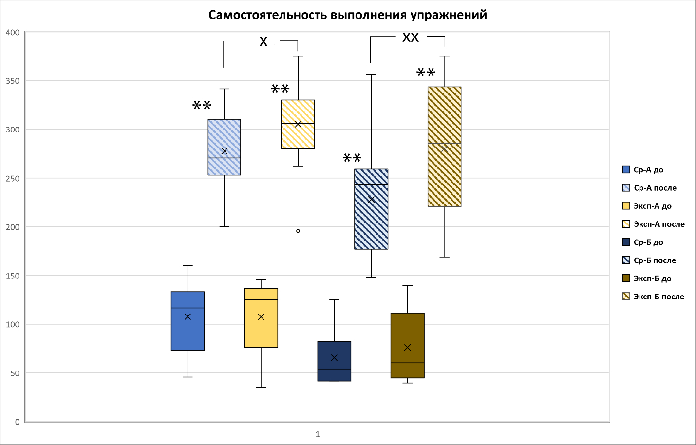 Примечание: По оси Y – баллы. По оси У – баллы. * достоверные различия между подгруппами по критерию Манна-Уитни до и после курса занятий (**– p < 0,01, ***– p < 0,001), х – достоверные различия между экспериментальной и сравнительной группами.