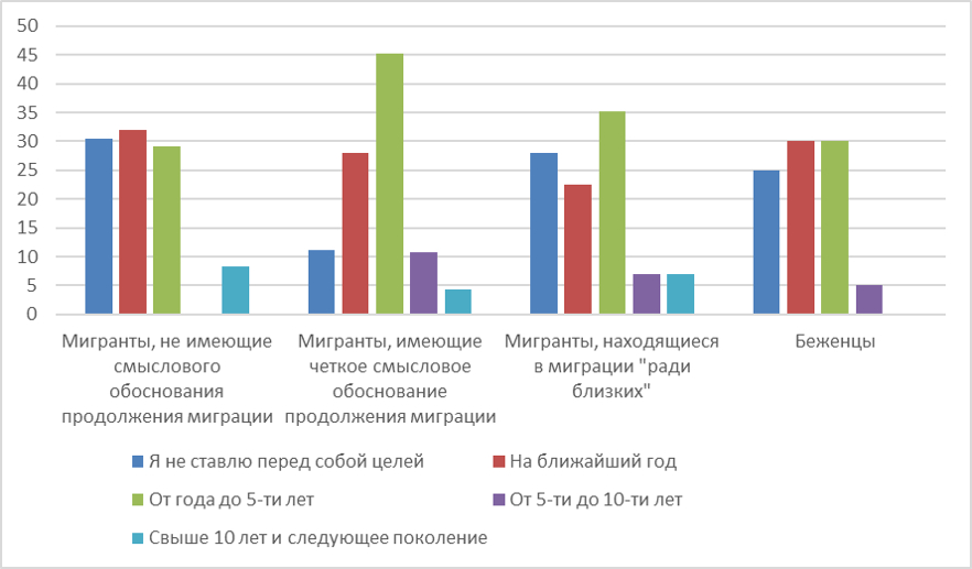 Мигранты, не имеющие смыслового обоснования продолжения миграции, менее расположены строить планы в принципе, целеполагание ориентировано на краткосрочную и среднесрочную перспективу. В образе будущего в большей степени преобладает настрой на семью и в меньшей – на карьеру или развитие материальной сферы.