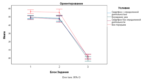 Касательно средних значений для сети ориентирования отмечены существенные различия. Группа, в которой смартфон использовали с определенной деятельностью (T1), показала снижение ошибок в среднем от блока 2 (M = 0,48) до блока 3 (M = 0,01), t(19) = 1,72, p < 0,0001. Группы с условиями блуждания ума (Т2) и группа без перерывов (Т4) показали снижение ошибок в среднем от блока 2 до блока 3, у Т2 (М = 0,48 до М = –,005), t(19) = 33,8, p < 0,001 и у Т4 (М =