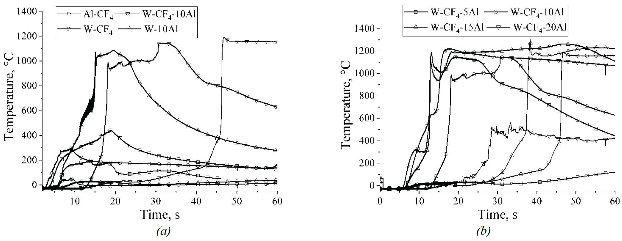 Ignition in the W–CF4–Al-based system began with the melting of aluminum and its interaction with tungsten to a temperature of 1200–1300 °C, regardless of the aluminum content (Fig. 4a). Then, a drop in temperature to 1100–1150 °C was recorded. A further increase in temperature to 1200–1400 °C was associated with the combustion of aluminum with TFM. An increase in the aluminum content increased the rate and duration of the reaction. Ignition of the W-PTFE-Al system began at a temperature of 800–1000 °C, since at this temperature intense evaporation of PTFE and the formation of TFM, which interacted with aluminum, begin (Fig. 4b).