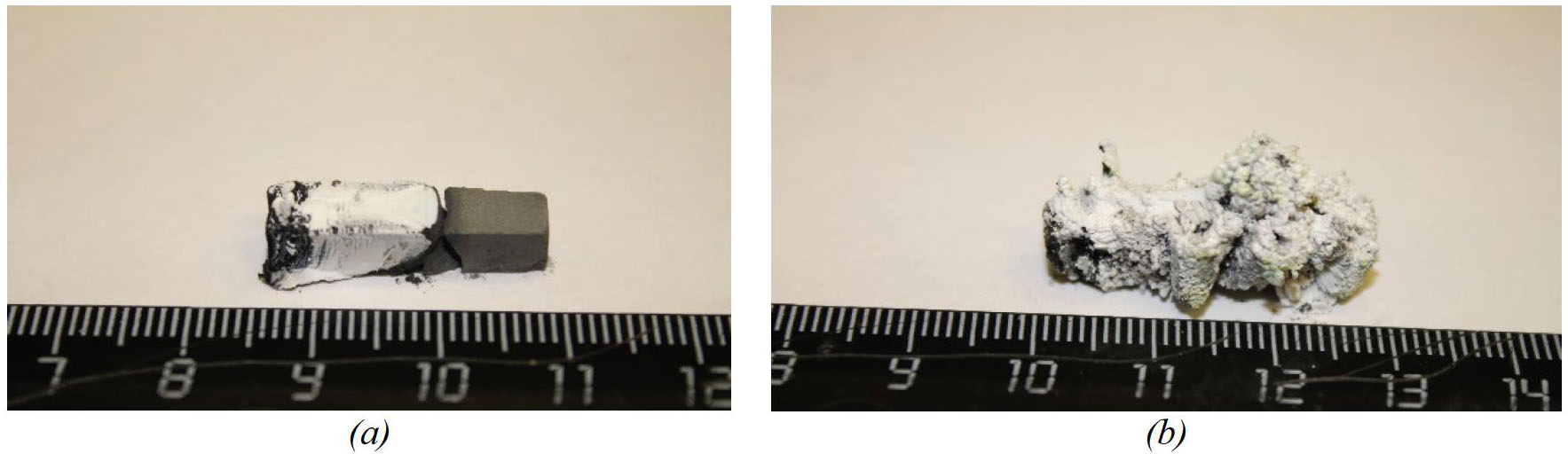 Fig. 7. Samples after combustion W–CF4–Al: a) 5 % Al, b) 20 % Al