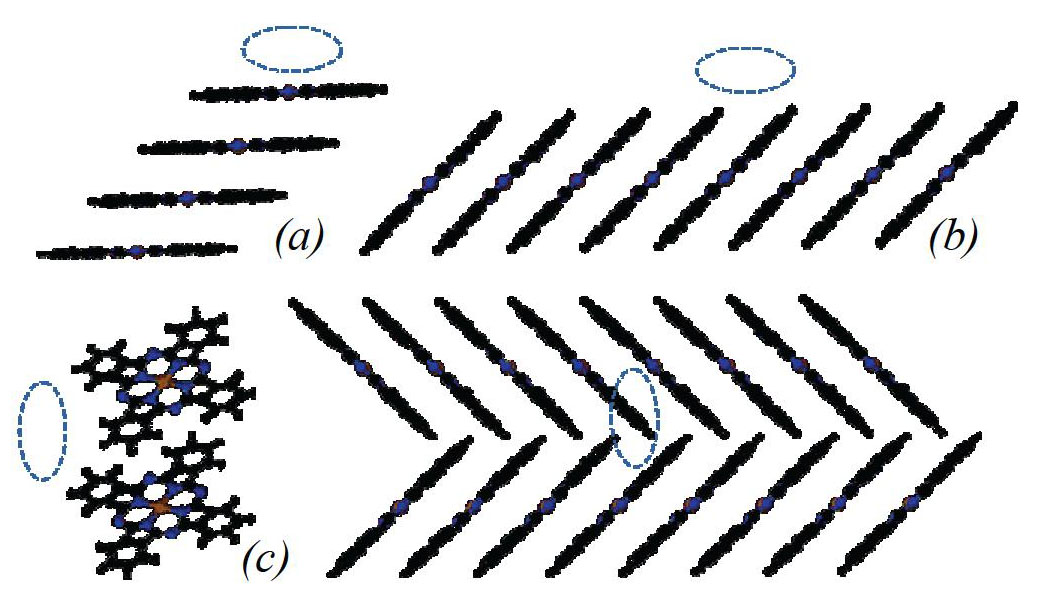 Fig. 2. Scheme of clusters for modeling sorption: a – per metal atom (4 molecules CuPc), b – per surface (8 molecules CuPc), c – per surface (001) (16 molecules CuPc), the expected position of the sorbate molecule is shown