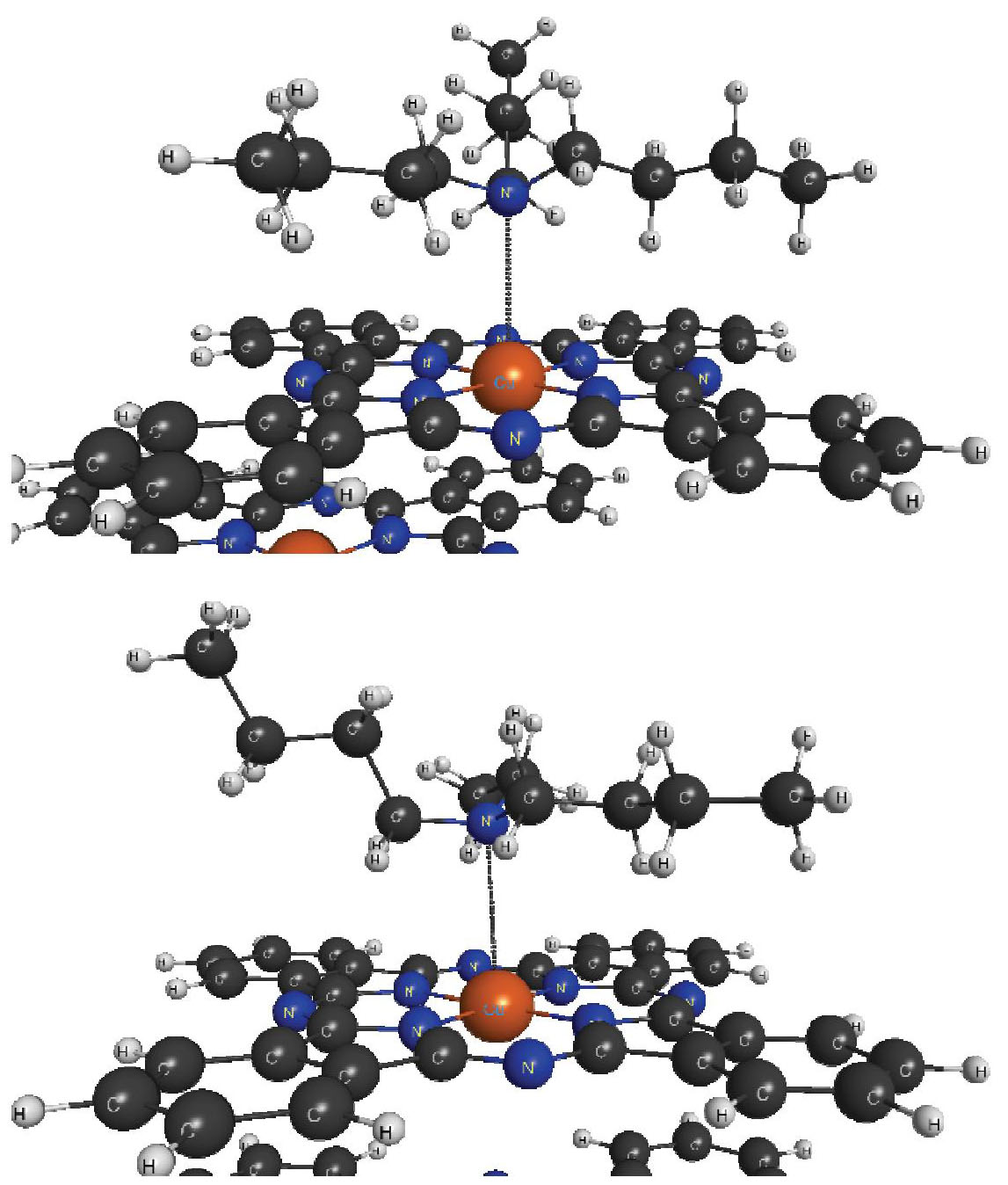 The structure of the complexes with the other trialkylamines is similar to the provided complex with tributylamine. The mechanism of ammonia adsorption on the surface of copper phthalocyanine through the metal atom was proposed in reference [8]. Trialkylamines, if their nitrogen atom is available for interaction, should behave similarly.
