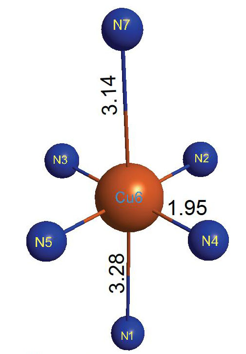 Fig. 5. Six-coordinated copper atom in a tributylamine complex with a surface, distances in angstroms
