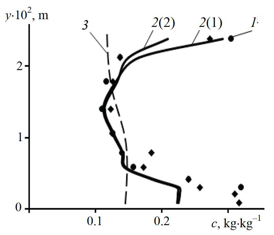 Fig. 7. Experimental 1 and calculated 2 and 3 profiles of concentration distribution of particles with small mass in the flow of mixture 3 (Table 1) on a rough gravity chute at different variants of determination of the quasi-diffusion separation coefficient: 2) calculation under assumption (2) according to (13); 3) calculation at Dm = 0