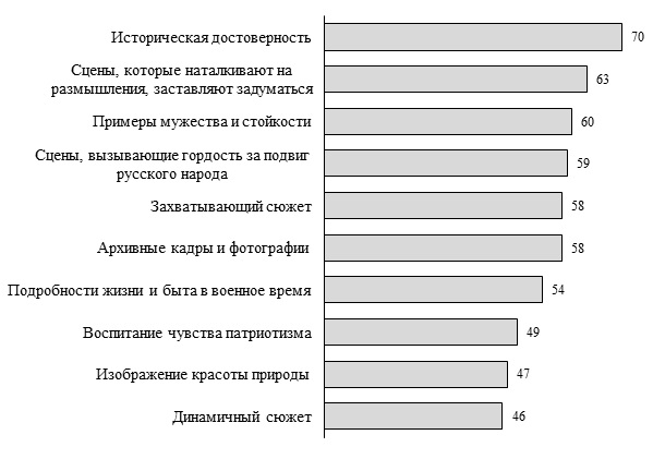 Приведённые данные говорят о том, что фильмы о Великой Отечественной войне во многом воспринимаются молодёжью в качестве исторического кинодокумента. Их основная цель – заставлять задуматься над прошедшими событиями, воспитывать чувство гордости за подвиг народа. И уже только потом – увлекать захватывающим динамичным сюжетом. Отрицательные характеристики также свидетельствуют о важности достоверности показанного на экране. Поэтому зрители подчеркивают, что в таких фильмах не должно быть каких-либо преувеличений: суперспособностей персонажей, вымышленных драматических сцен, карикатурного изображения врага или же, собственно, преувеличение героизма с целью воодушевления зрителя.