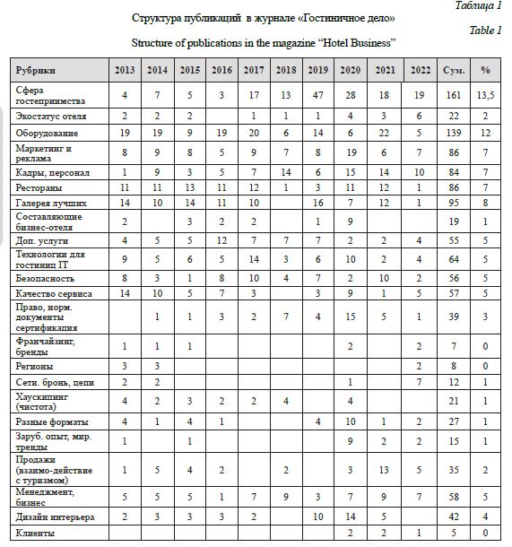 Анализ таблицы показывает, что журнал ориентирован на практический бизнес. Самое большое место в нем (13,5 %) занимают общие проблемы, включая статистику отрасли и конкретные проблемы: ковид, санкции и др. Из собственно практических вопросов журнал предлагает информацию об оборудовании (12 %), опыт работы лучших отелей (9 %). На третьем месте по популярности (практически в равной доле): маркетинг, кадры и работа ресторанов. На четвертом –