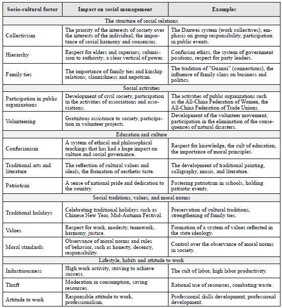 Social governance in China in the context of globalization is aimed at creating a harmonious and prosperous society where every citizen can realize their potential, and the state ensures stability and development based on the principles of democracy and the rule of law. In the context of globalization, the transformation of traditional social control mechanisms into modern models of social governance in China determines the need for a comprehensive reassessment and modification of the fundamental concepts, methods and tools used by the party and the government in this area. The evolution of social management, first of all, involves the rejection of outdated paradigms and stereotypes of thinking inherent in traditional social control. At the same time, rethinking and updating of social management systems and models is required, with an emphasis on legitimizing and standardizing the relevant processes. In this regard, the analysis of socio-cultural factors influencing social governance in China is becoming key to understanding the country's development prospects. The following is table 2, which systematizes the main socio-cultural factors influencing social governance in China (Laurent 2020).
