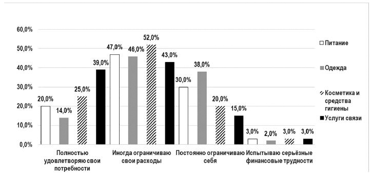 заявили, что им приходится постоянно экономить, что может указывать на недостаточный уровень доходов или высокие цены на одежду. Лишь 2 % испытывают серьёзные финансовые трудности в этой категории, что соответствует общей картине умеренного финансового состояния студентов.