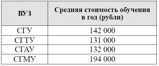 Н.И. Вавилова (СГАУ) стоимость обучения в среднем примерно одинакова – 131 000 и 132 000 рублей соответственно. Это самые низкие затраты среди четырёх вузов (табл. 2).