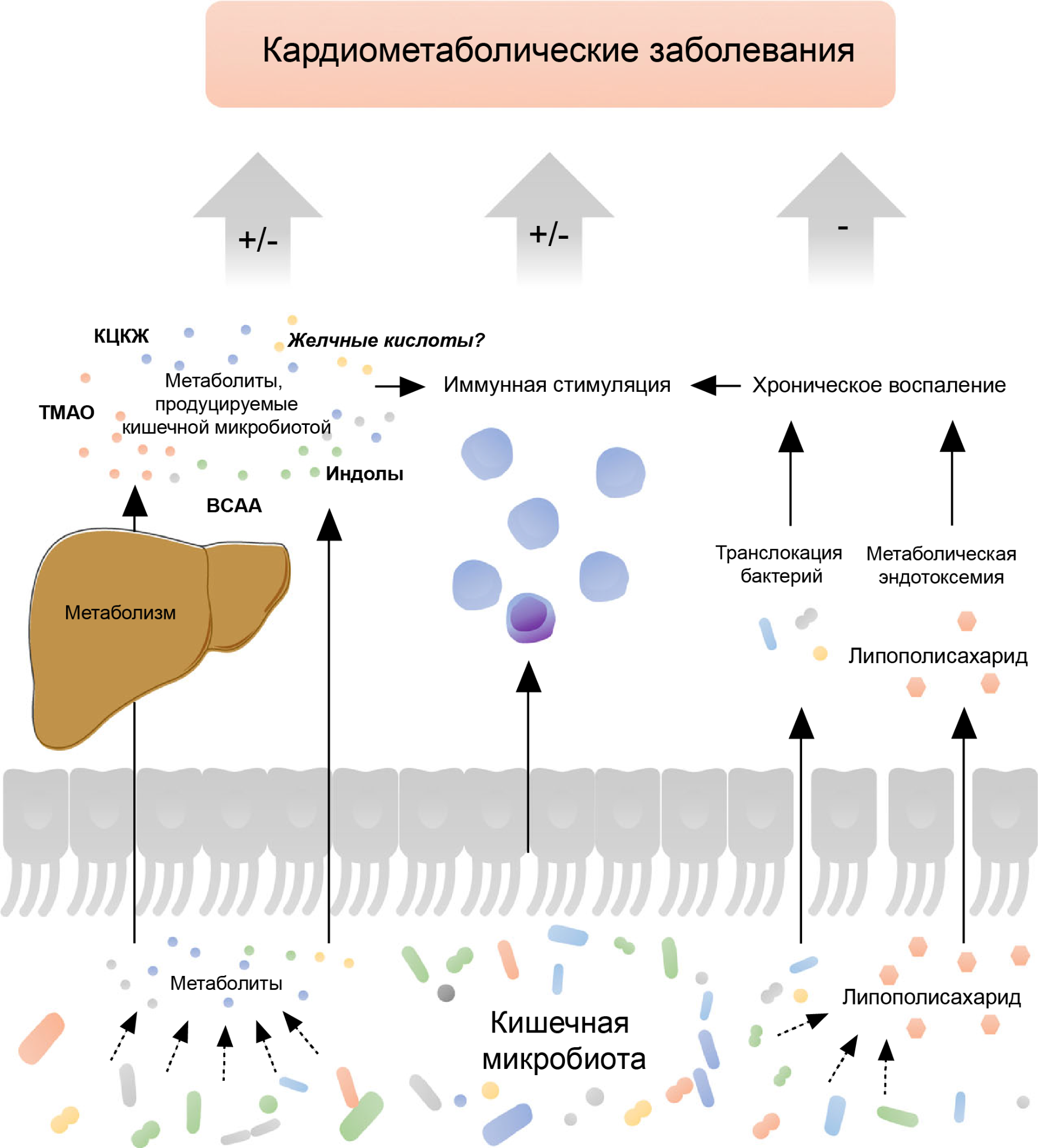 Рисунок 1. Основные механизмы развития кардиометаболических заболеваний, ассоциированные с кишечной микробиотой. TMAO: триметиламин-N-оксид, КЦКЖ: короткоцепочечные жирные кислоты, ВСАА: аминокислоты с разветвленной цепью. “± ” указывает либо на положительное, либо на отрицательное влияние, “-“ указывает на отрицательное влияние. Адаптировано из Kappel, B.A., Federici, M. Gut microbiome and cardiometabolic risk. Rev. Endocr. Metab. Disord 20, 399–406 (2019). DOI: 10.1007/s11154-019-09533-9